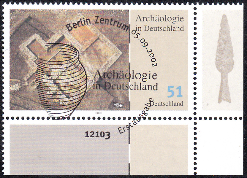 Hier das von Heinz bereits vorgestellte Postwertzeichen, das die in Wurmlingen zu besichtigenden Reste eines römischen Gutshofes sowie eines römischen Bades zeigt. In einer Serie zum Thema "Archäologie in Deutschland" erschien bei der Deutschen Post dieses Postwertzeichen, MiNr. 2281, mit einer Abbildung der Grundmauern des Badegebäudes eines römischen Gutshofes in Wurmlingen mit Pfostenspuren eines danach eingebauten frühalemannischen Speichers (um 260):