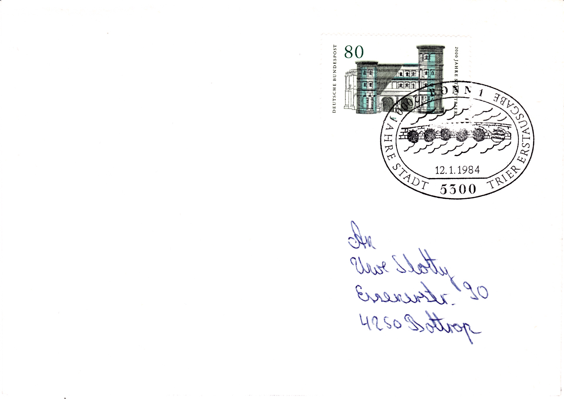 Im Ersttagsonderstempel aus Bonn zur Marke "2000 Jahre Stadt Trier" wird die Römerbrücke in Trier gezeigt.