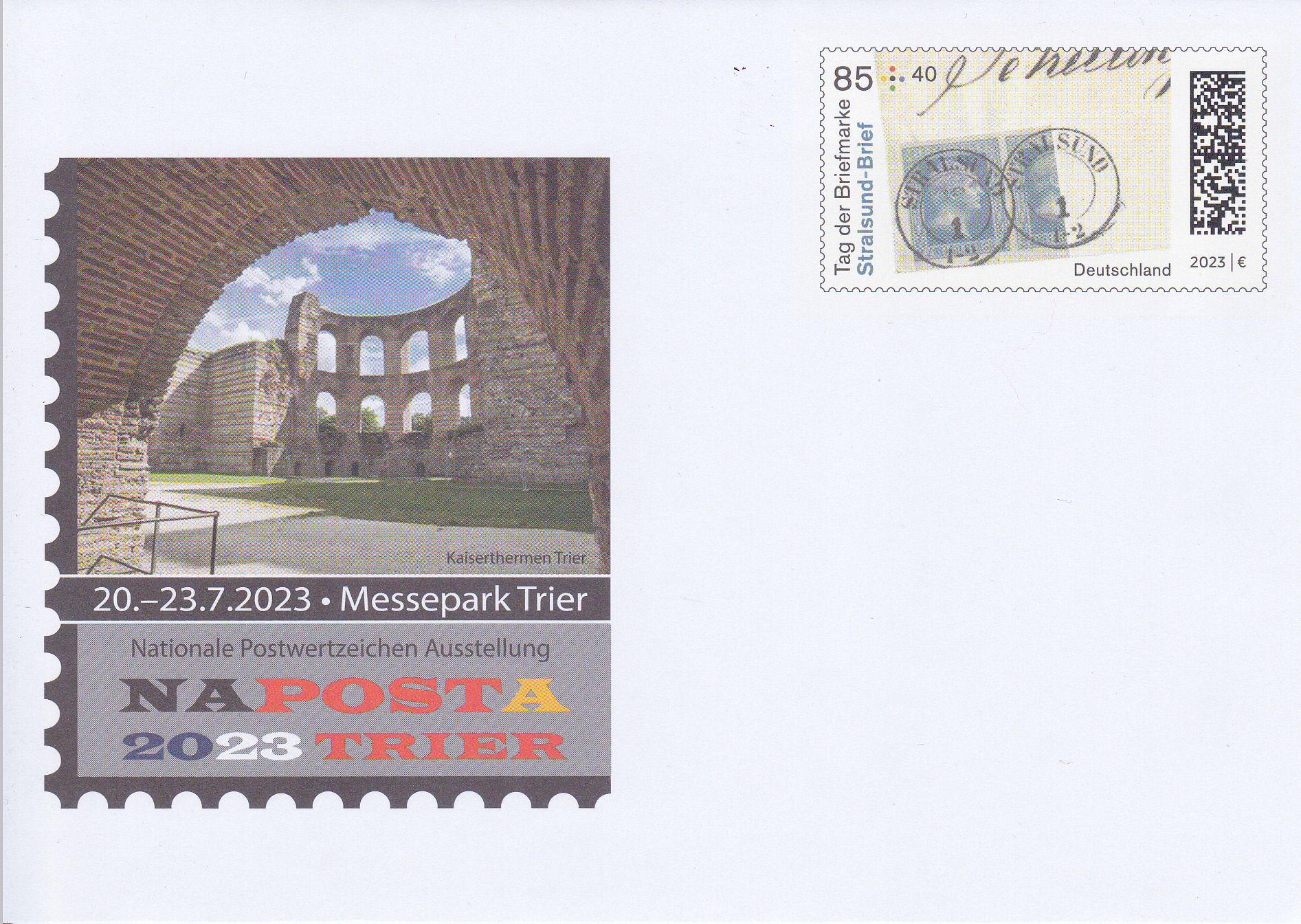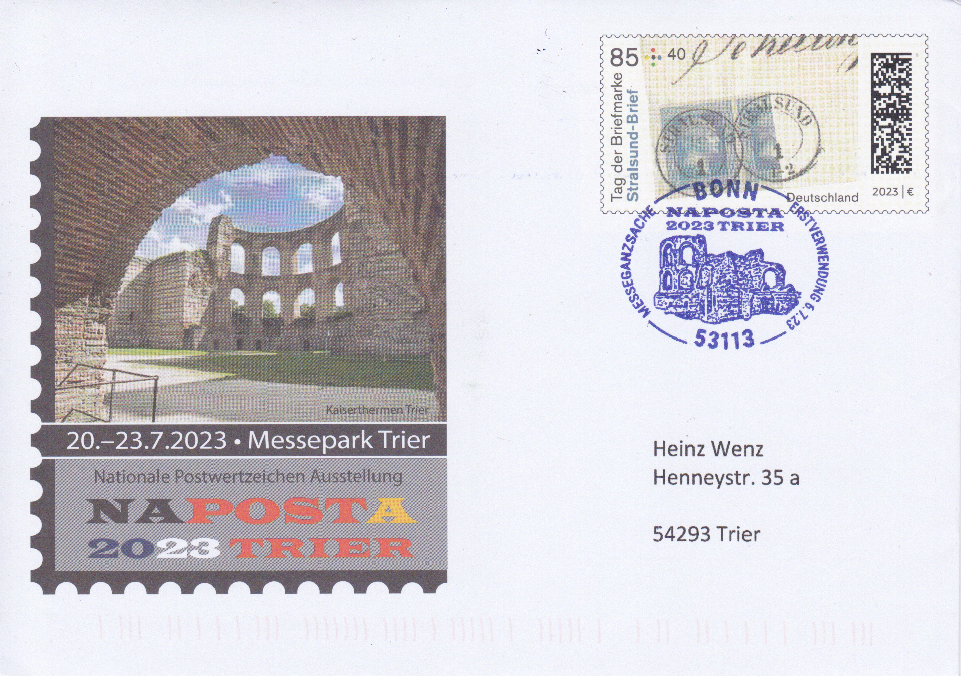 Messeganzsache "NAPOSTA 2023 Trier" mit dem Erstverwendungsstempel aus Bonn, der ebenfalls die Kaiserthermen zeigt.