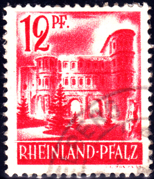 Auch diese Marke aus Rheinland-Pfalz (MiNr 4) zeigt im Markenbild die Porta Nigra.