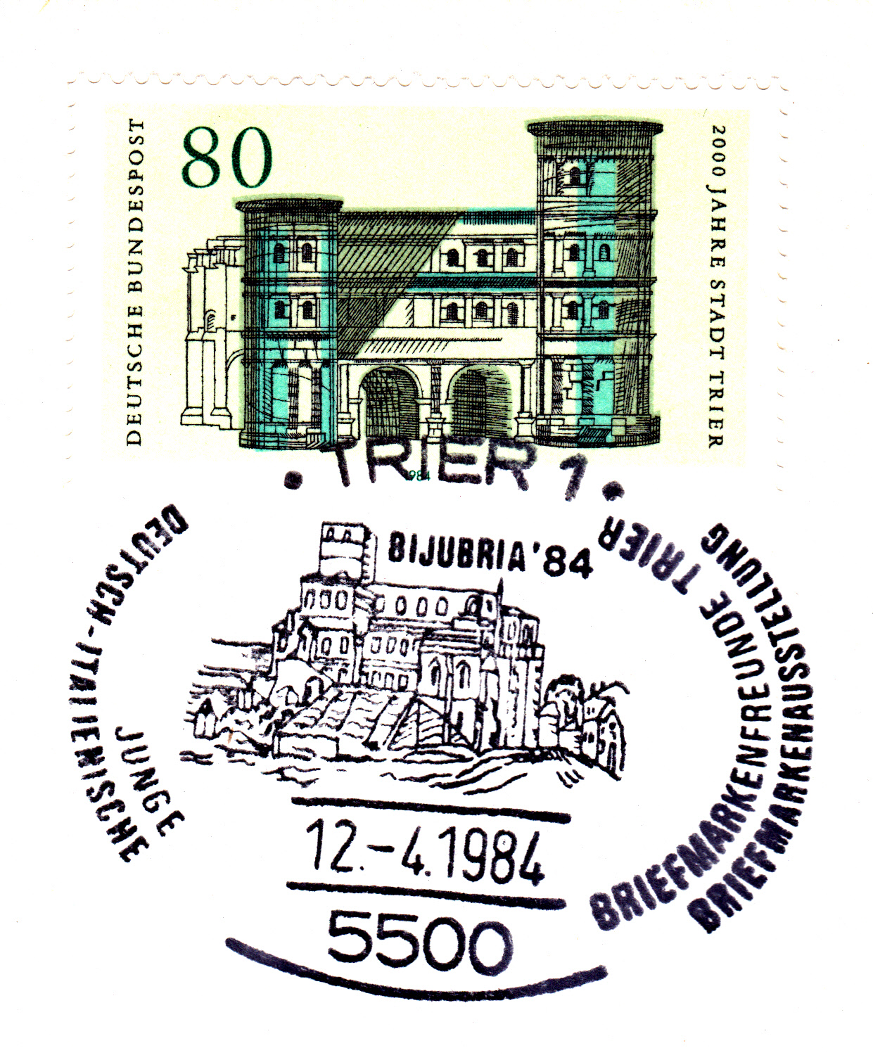 Zur 2000-Jahrfeier der Stadt Trier erschien am 12.1.1984 bei der Deutschen Bundespost eine Sondermarke mit der Porta Nigra im Markenbild. Hier zeige ich ein Exemplar mit einem Sonderstempel aus Trier vom Ersttag. Im Stempelbild erscheint die Porta Nigra als Simeonskirche nach einem Stich von Caspar Merian aus dem Jahre 1670.
