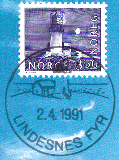 In Norwegen wurde dieser Leuchtturm auf einer Freimarke (MiNr 877) gezeigt. Hier diese Marke auf einer "Maximumkarte" der Firma Leuchtturm mit dem Poststempel "Lindesnes FYR" am 2.4.1991 gestempelt. Im Stempel ist ebenfalls der Leuchtturm zu sehen.