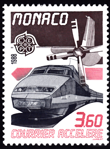 Auf der Europamarke 1988 zu 3,60 Franc aus Monaco zum Thema Transport- und Kommunikationsmittel wird im Markenbild ein Hochgeschwindigkeitszug "TGV" gezeigt.