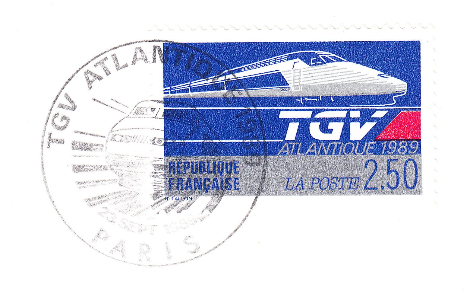 Am 23.09.1989 zur Eröfffnung der Hochgeschwindigkeitsstrecken von Paris nach Nantes und Rennes erschien in einer Auflage von 6 588 053 Stück dieses Postwertzeichen, hier als Briefstück mit ESST Paris: