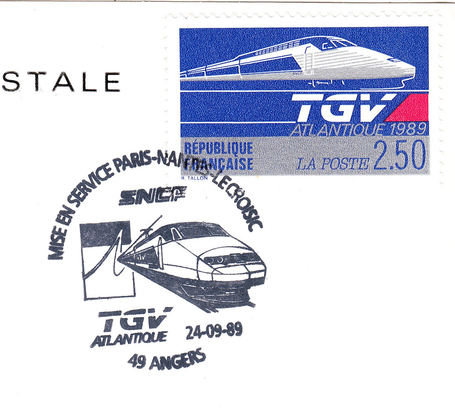 Am 24.09.1989 begann mit zunächst 21 Garnituren der kommerzielle Einsatz des TGV auf der neuen Atlantique - Strecke, was dieser Sonderstempel aus Angers dokumentiert: