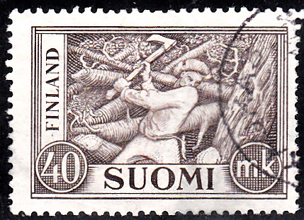 Marke aus Finnland zu 40 Finnmark (MiNr 406) mit dem gleichen Motiv eines Holzfällers beim Fällen eines Baumes.