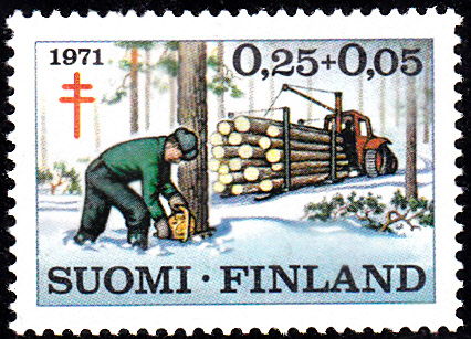 Auf dieser Marke aus Finnland (MiNr 686) wird ein Hölzfäller mit einer Kettensäge und der Abtransport der gefällten Bäume gezeigt.