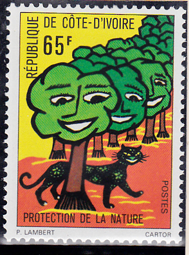 In der Elfenbeinküste erschien 1976 diese Marke (MiNr 489) zum Thema Naturschutz. Im Markenbild werden stilisierte Bäume mit Gesichtern und ein Panther gezeigt.