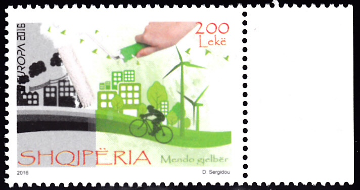 In Albanien ist eine Europamarke 2016 am 9.7.2016 erschienen. Die Marke zu 200 Lek erschien zum Gemeinschaftsthema "Umweltbewusst leben" mit dem Einheitsmotiv "Von Grau zu Grün" nach einer Grafik von Doxia Sergidou (Zypern). Die Auflage dieser Marke betrug 315 000 Stück. Hier eine Marke vom rechten Bogenrand: