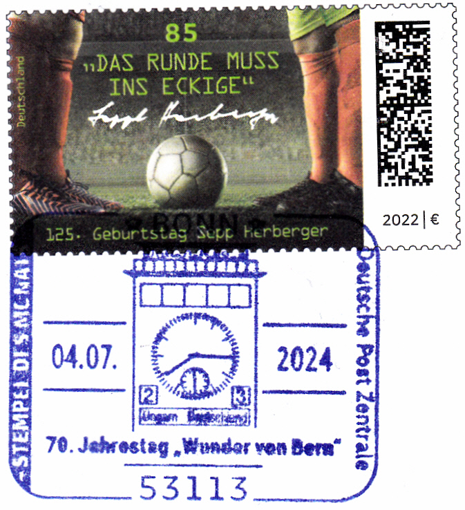 Zu dieser Gedenkganzsache wurde am Ausgabetag in Bonn noch ein zweiter Sonderstempel eingesetzt. Er zeigt im Stempelbild den Westturm mit Stadionuhr und Spielstand im Wankdorf-Stadion Bern von 1954.