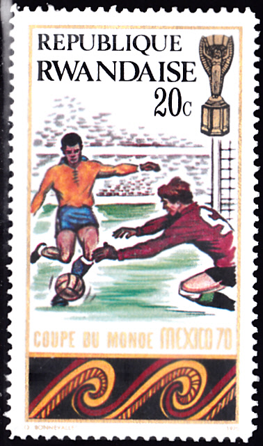 Aus Ruanda stammt diese Marke (MiNr 384 A) zur WM 1970. Sie zeigt einen Stürmer beim Torschuss und den gegnerischen Torwart. Ob er hält?