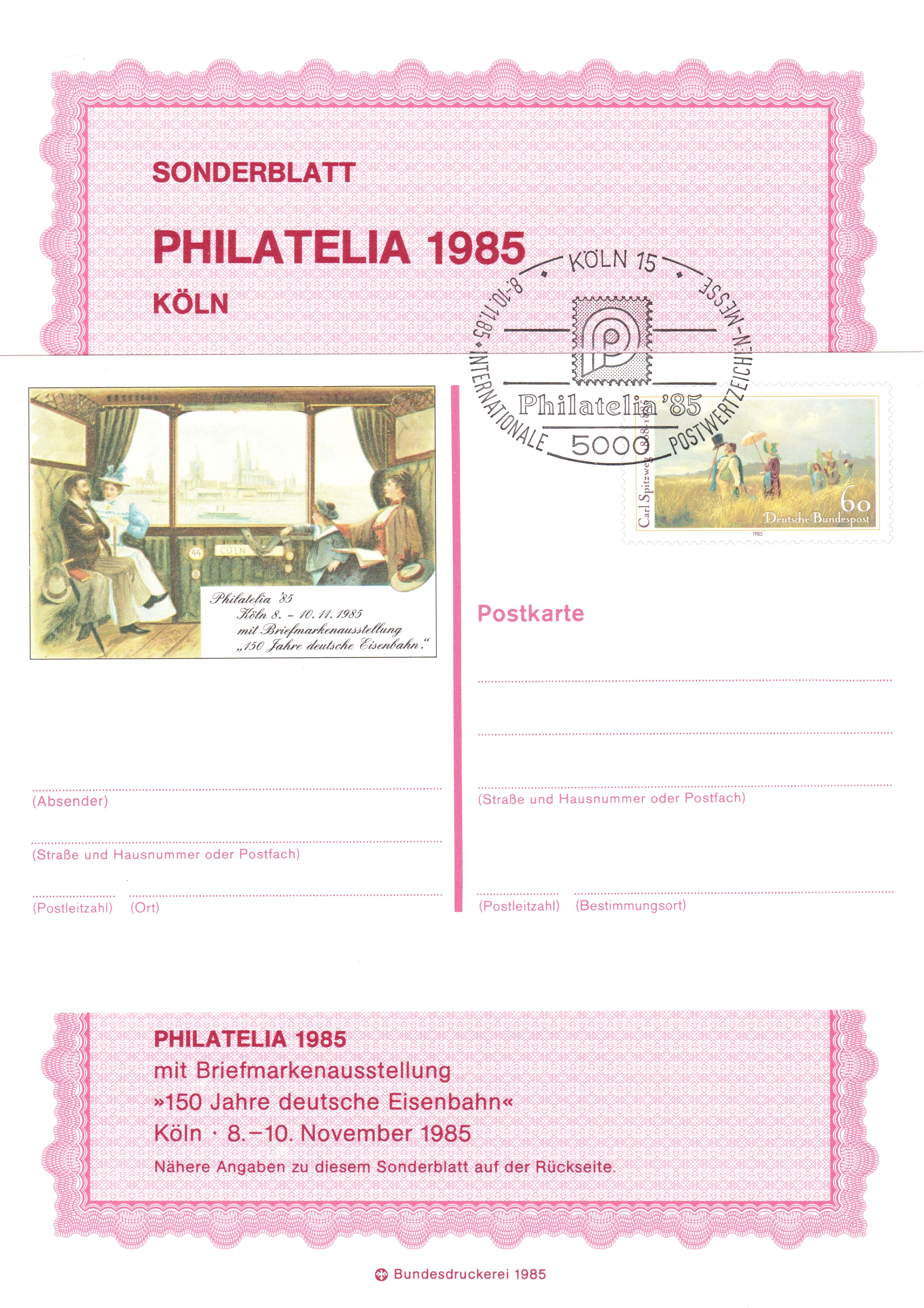 Dieses "SONDERBLATT" mit Druckvermerk "Bundesdruckerei 1985" wurde zur Philatelia ´85 in KÖLN 15 aufgelegt:
