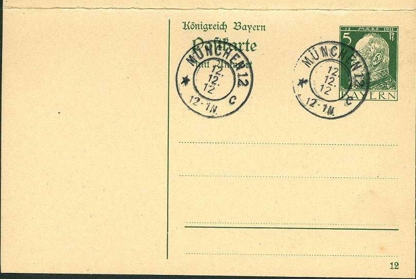 Ein Tagesstempel vom 12.12.1912 wurde auf dieser Bayern-Ganzsache (Altdeutschland) abgeschlagen. Sowohl auf dem Frage-