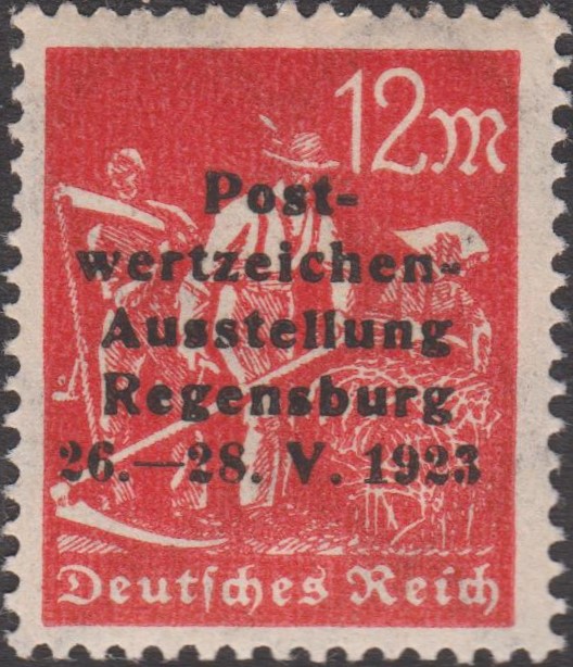Als Werbemaßnahme zur "Postwertzeichen-Ausstellung Regensburg 26. - 28. V. 1923" wurden mehrere verschiedene gültige Postwertzeichen des Deutschen Reiches mit einem privaten, fünfzeiligen, schwarzen Aufdruck versehen!