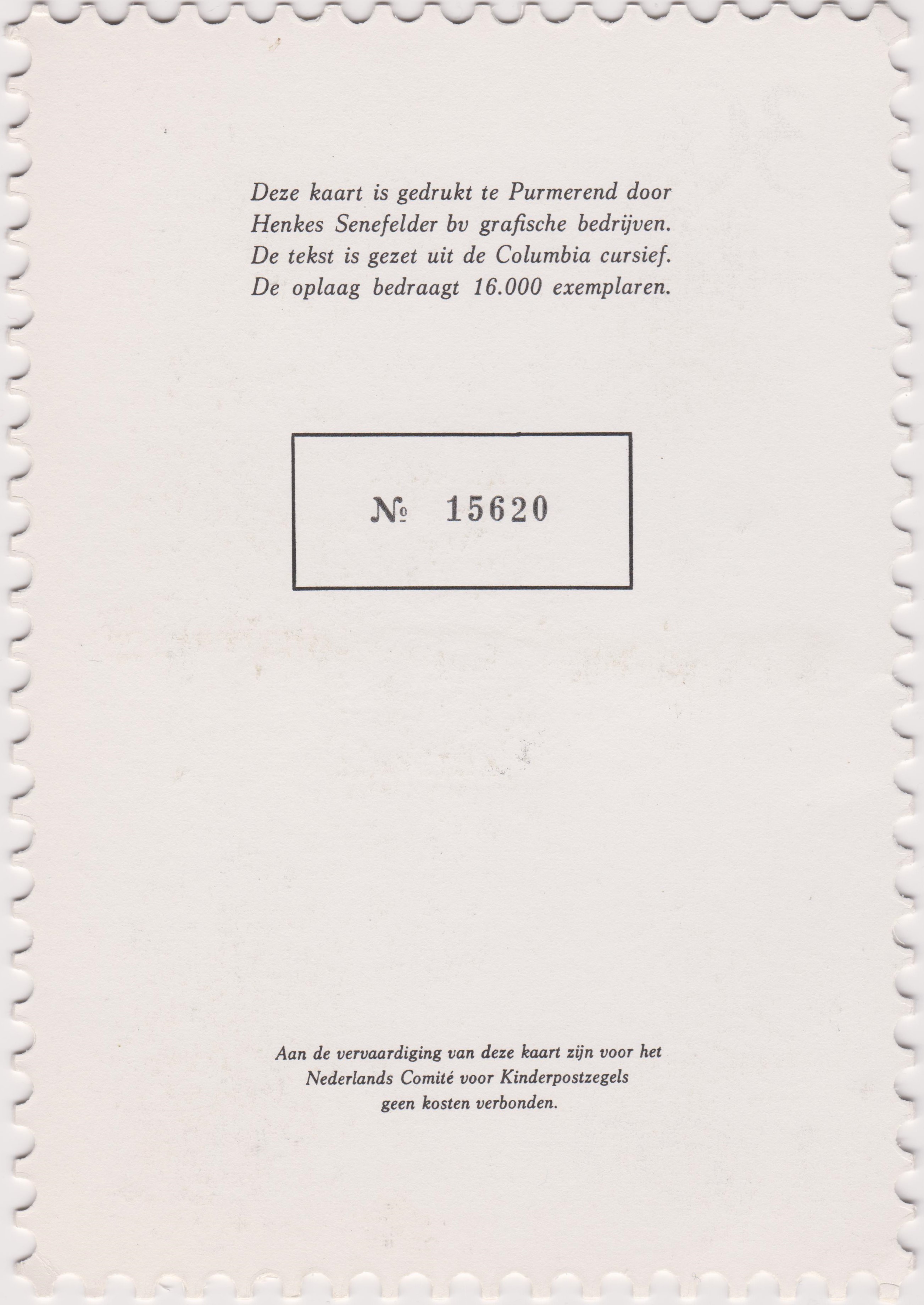 Die hier gezeigte Karte zur "Kinderpostzegelactie 1974" (= Kinderpostbriefmarkenaktion 1974) mit Niederlande MiNr. 1039, gestempelt am 12.11.1974 = Ersttag, hatte eine Auflage von 16.000 Stück und trägt die Nummer "15620".