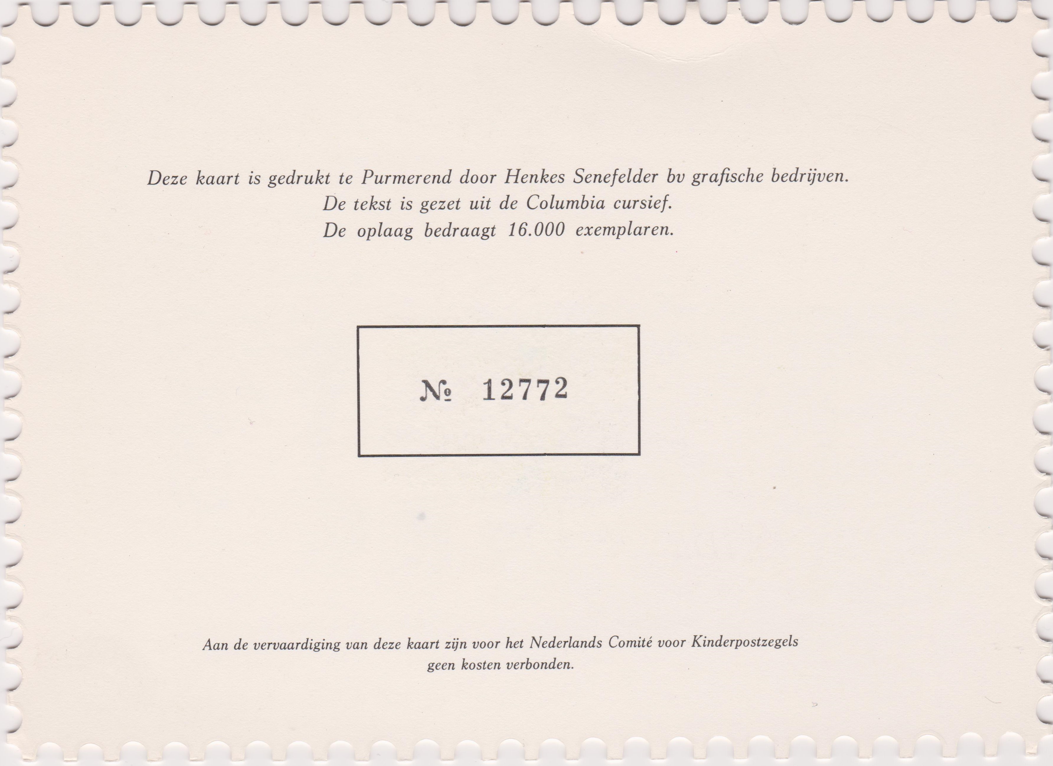 Die hier gezeigte Karte zur "Kinderpostzegelactie 1975" (= Kinderpostbriefmarkenaktion 1975) mit Niederlande MiNr. 1059, gestempelt am 11.11.1975 = Ersttag, hatte eine Auflage von 16.000 Stück und trägt die Nummer "12772":