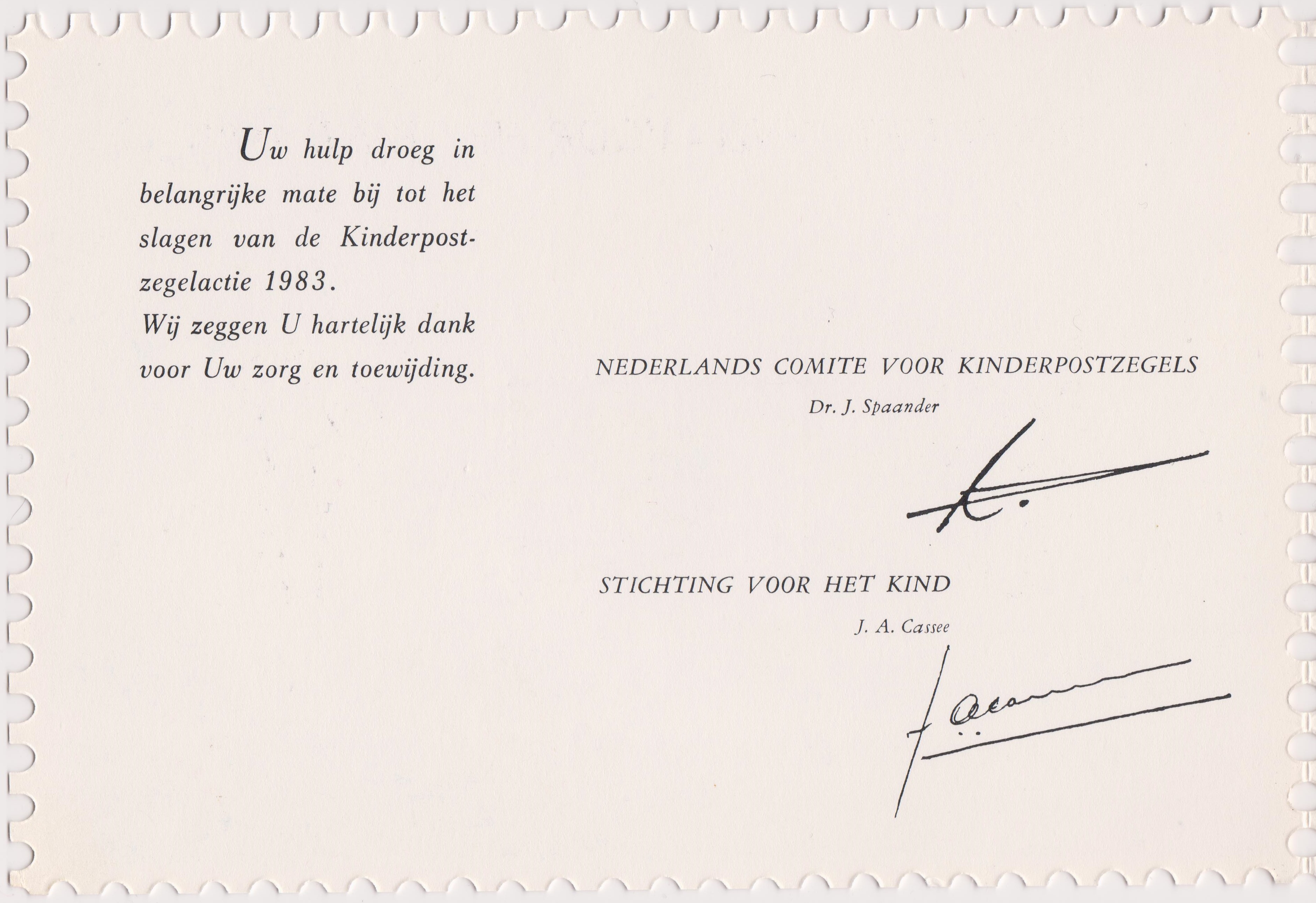 Die hier gezeigte Karte zur "Kinderpostzegelactie 1983" (= Kinderpostbriefmarkenaktion 1983) mit Niederlande MiNr. 1242, gestempelt am 16.11.1983 = Ersttag, hatte eine Auflage von 17.000 Stück und trägt die Nummer "004699":