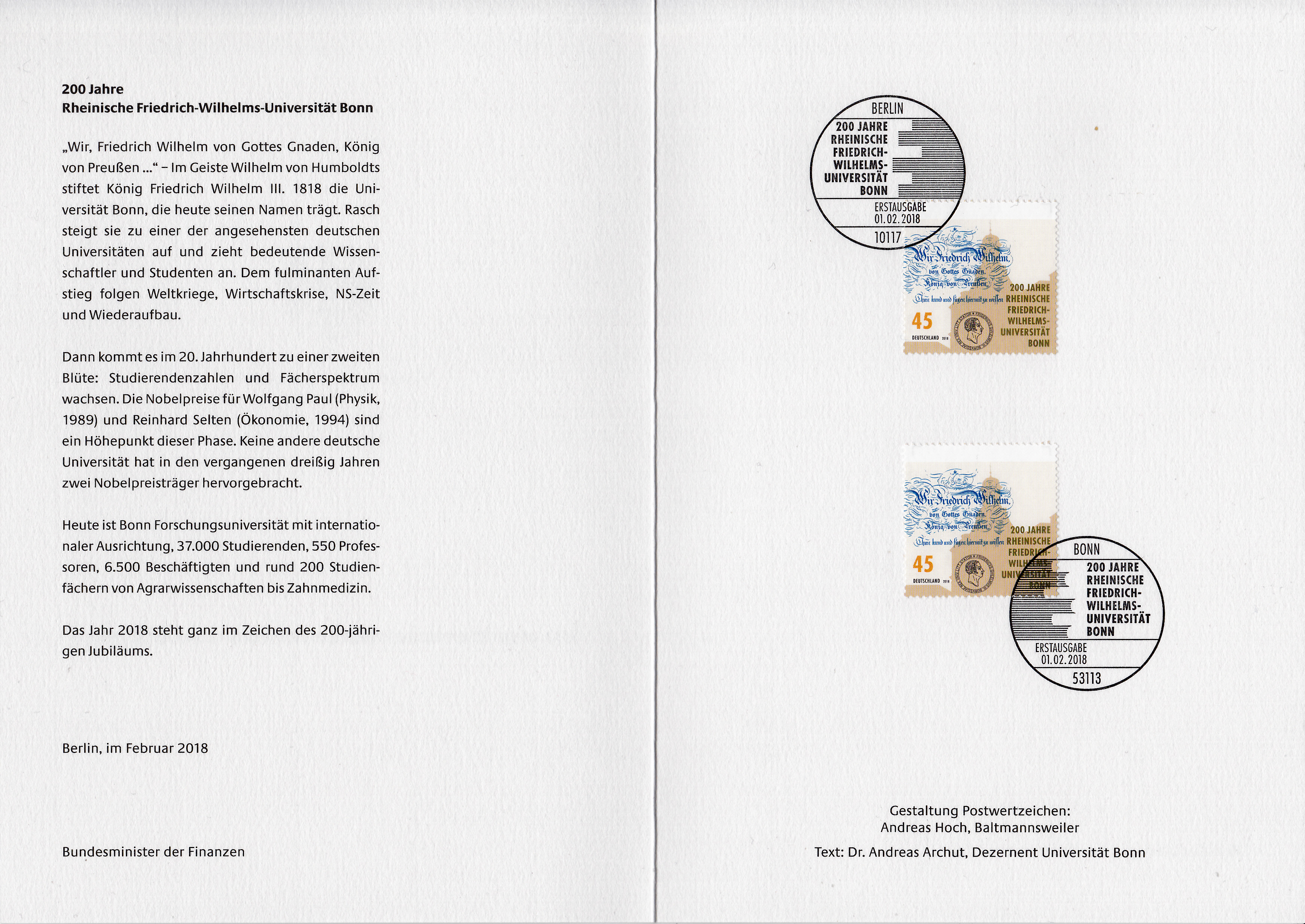 Im Februar 2018 sind die Wohlfahrtsmarken erschienen. Diese weiße Ministerkarte des Finanzministers hat sich gegenüber den vorhergehenden Ministerkarten mit Zuschlagsmarken nicht verändert. Sie enthält weiterhin eine Serie, die mit zwei Berliner und einem Bonner Ersttagsonderstempel gestempelt sind. In diesem Jahr sind die Februarausgaben immer noch ohne Unterschrift, da nach der letzten Bundestagswahl noch kein neuer "ordentlicher" Finanzminister ernannt war.