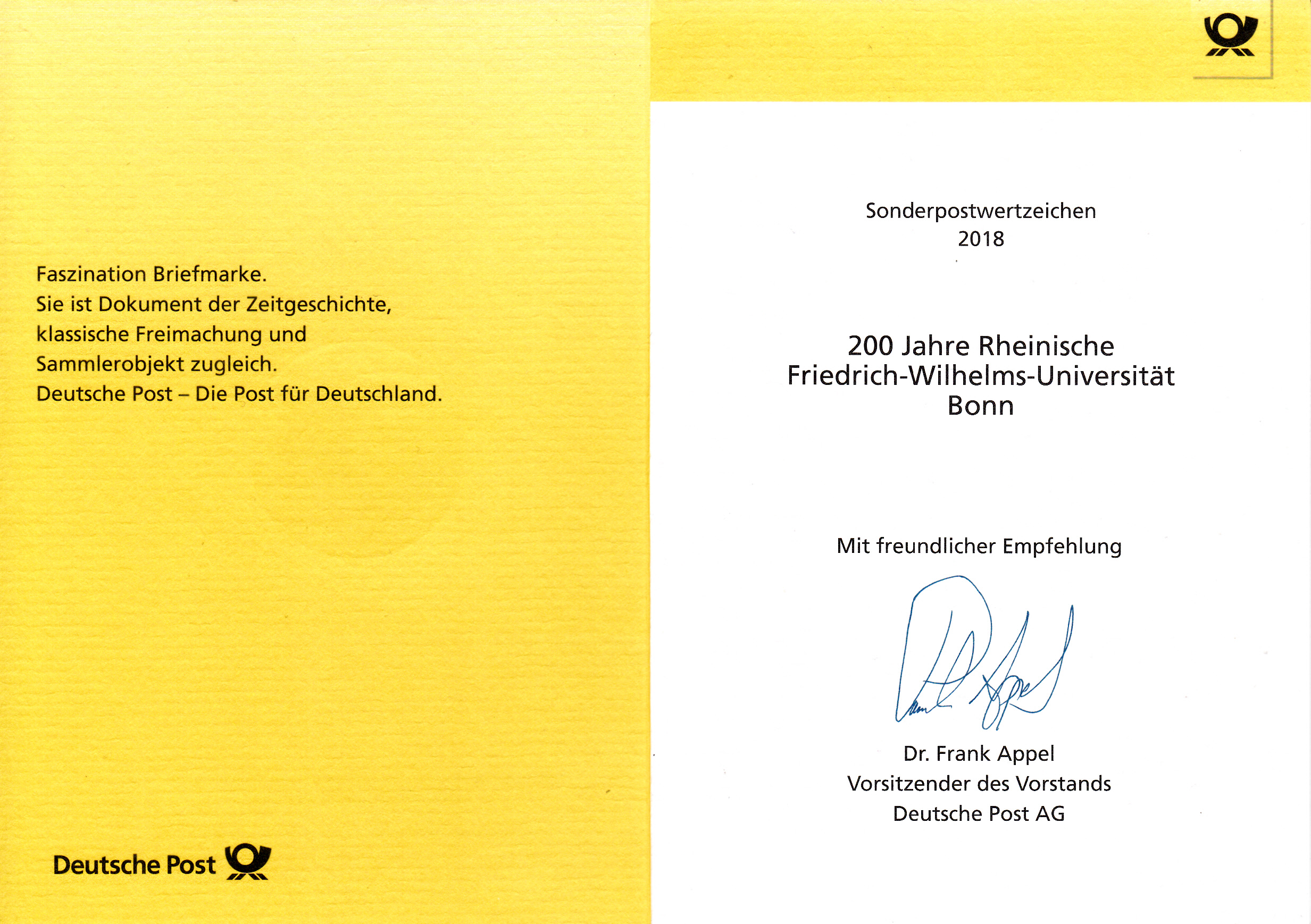 Klappkarte des Vorstandsvorsitzenden der Deutschen Post AG mit der Marke "200 Jahre Rheinische Friedrich-Wilhelm-Universität, Bonn" und dem Ersttagsonderstempel aus Bonn.