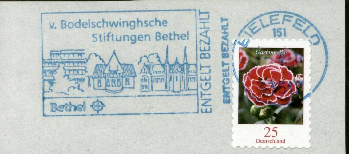 Hier noch der versprochene blaue Stempel, leider nur auf Einzelmarke und nicht auf Briefstück oder Brief, daher unvollständig. Der Stempeltyp ist etwas anders, aber auch hier wurde ein Freistempel zur Entwertung verwendet. Diese blauen Stempel sind mir nur aus Bielefeld bekannt, dafür von verschiedenen Stempeltypen.