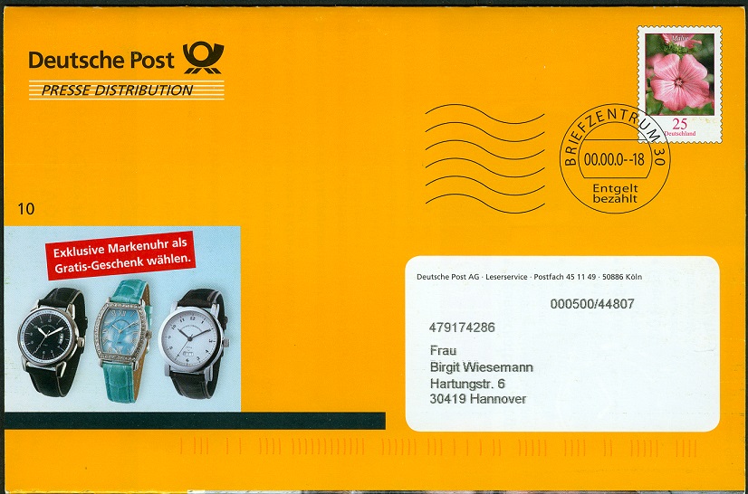 Auch nicht so oft zu finden sind manche Eigenausgaben der DP AG, wie zum Beipsiel die EA H 11/02. Der gedruckte Vorausentwertungsstempel beinhaltet das BZ 30.