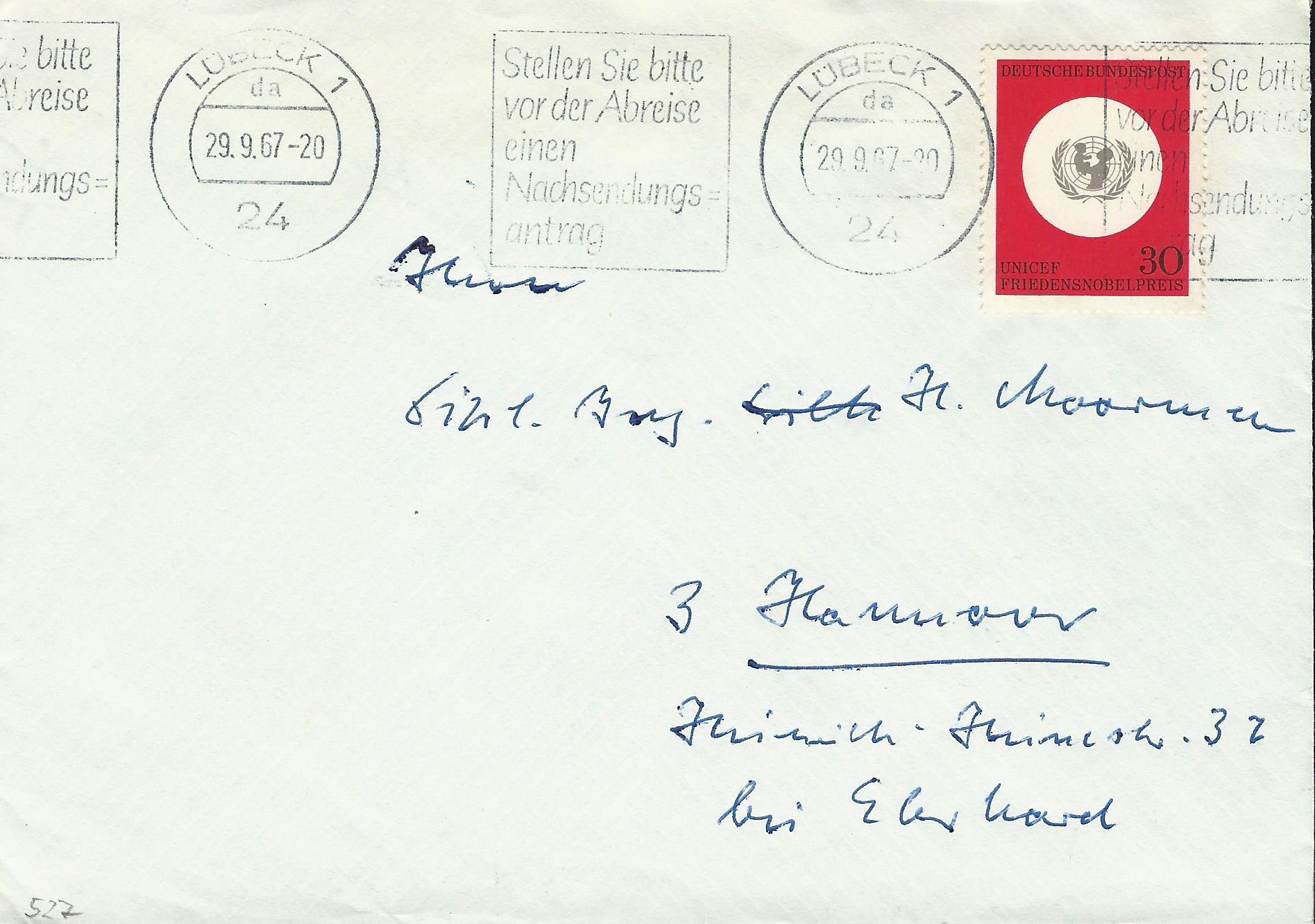 Und der letzte für heute wieder aus meiner Heimatstadt Lübeck vom 29.9.67: Stellen Sie bitte vor der Abreise einen Nachsendeantrag!