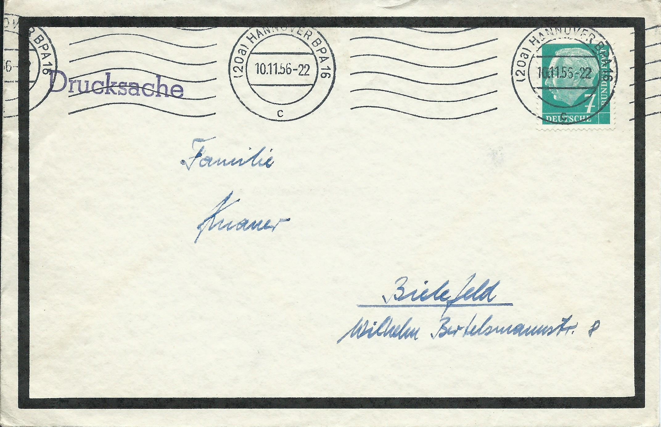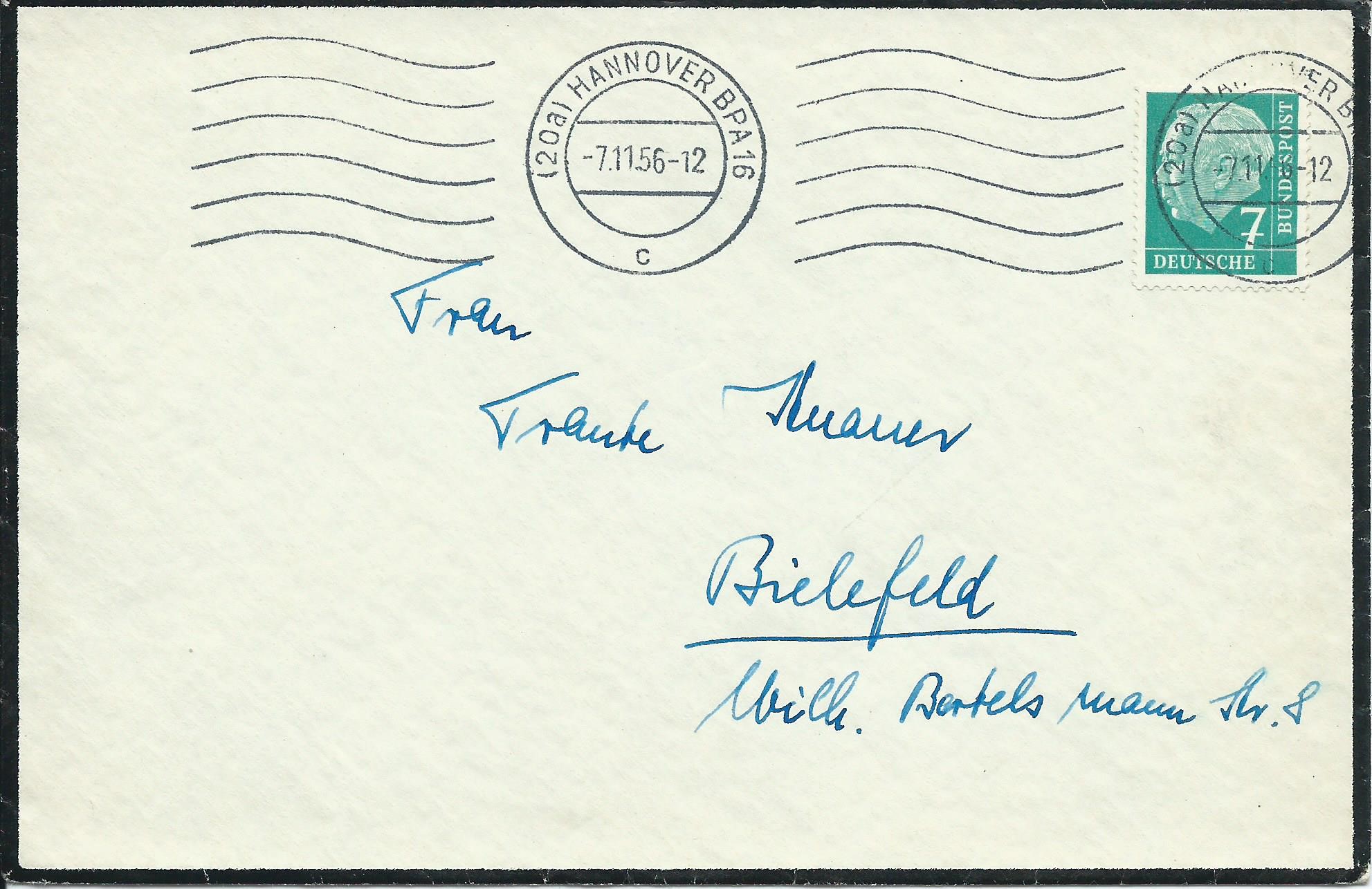 Nun folgen 3 Trauerbriefe aus Hannover BPA 16. Hier ist jeweils nur eine Welle an Stelle der Werbung eingesetzt. Der erste Beleg datiert vom 7.11.56: