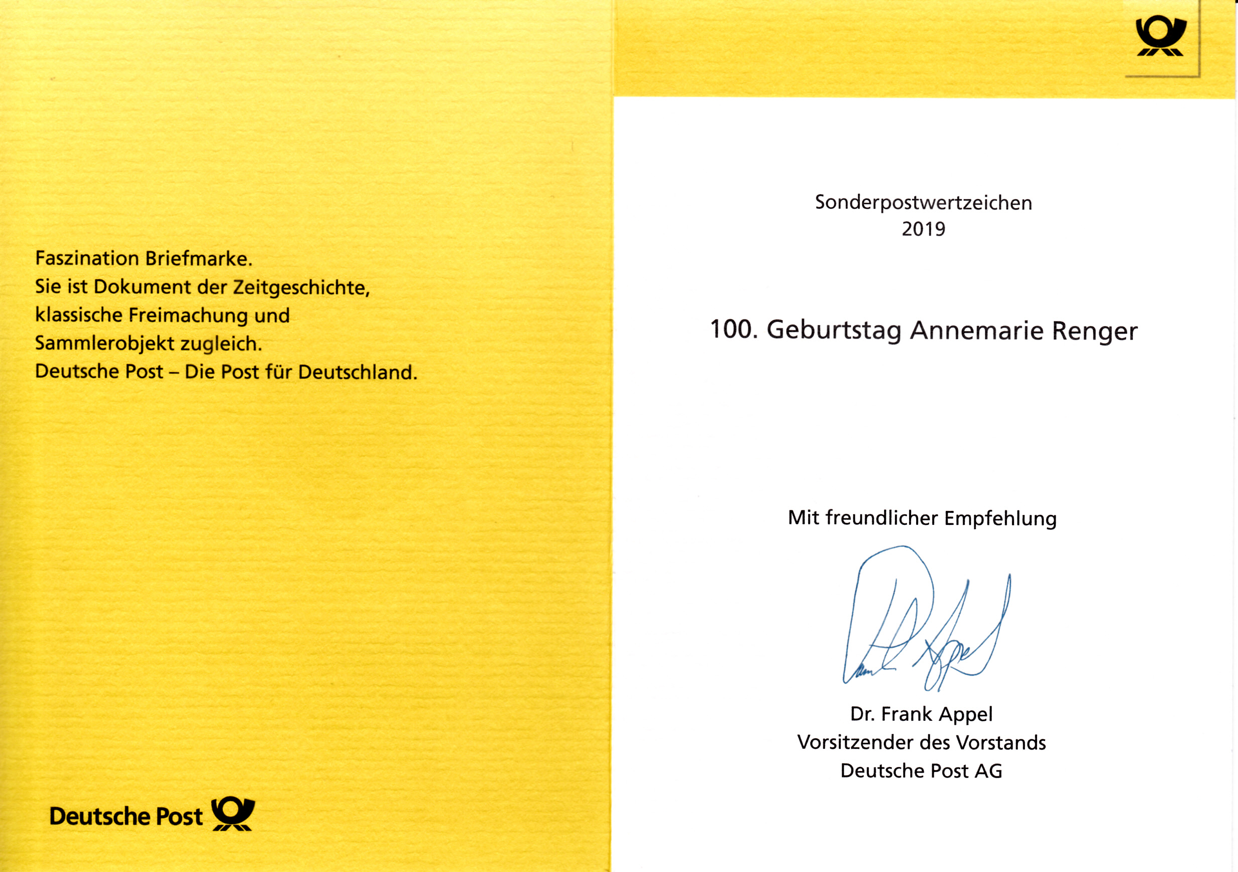 Klappkarte des Vorstandsvorsitzenden der Deutschen Post AG mit der Marke zum 100. Geburtstag von Annemarie Renger (MiNr 3499) und dem Ersttagsonderstempel Bonn.
