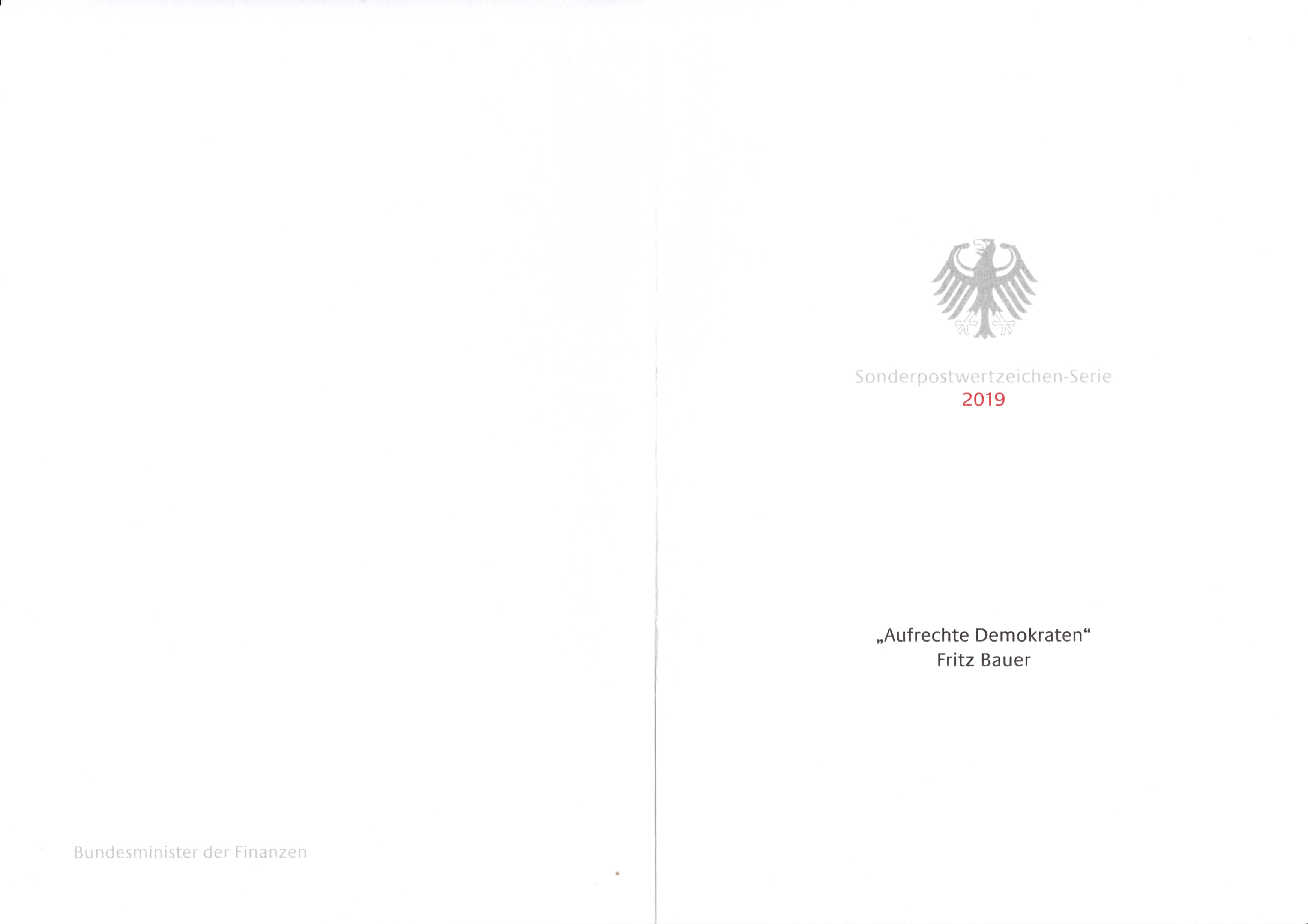 Ministerkarte des Finanzministers mit zwei Marken aus der Serie "Aufrechte Demokraten" mit dem Motiv "Fritz Bauer" (MiNr 3502) und den beiden Ersttagsonderstempel Bonn und Berlin.