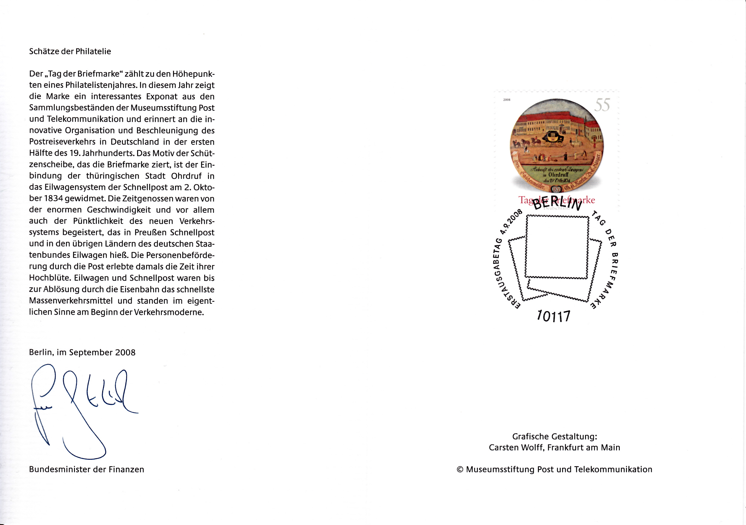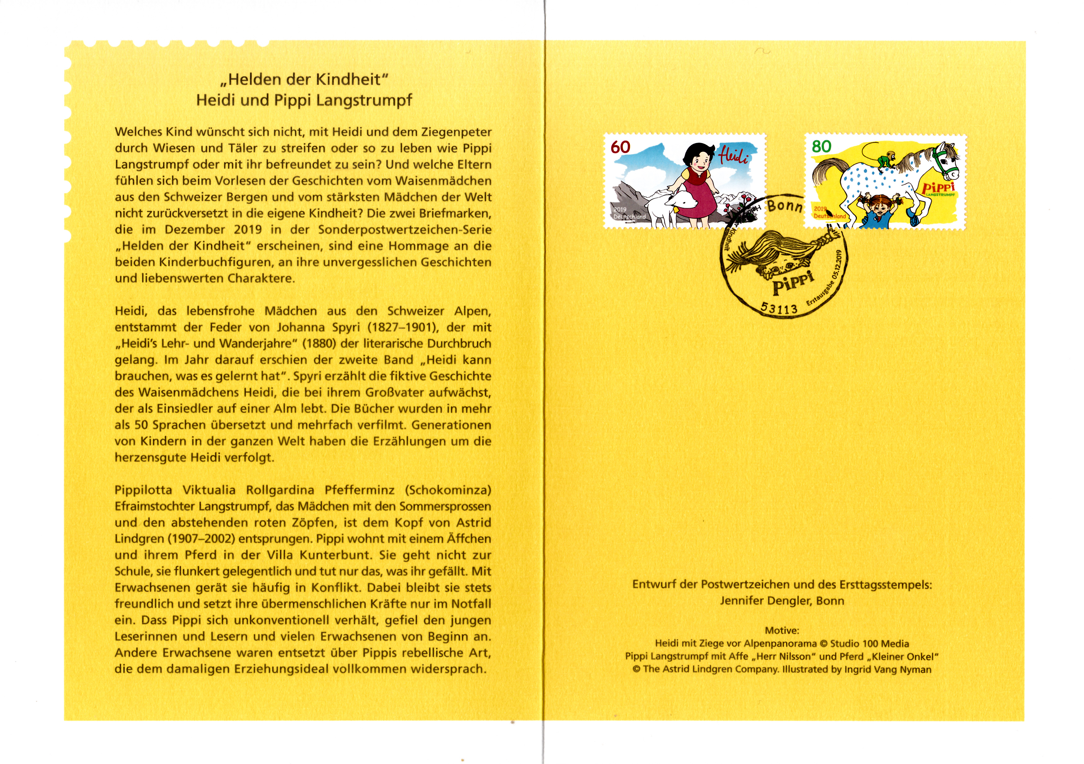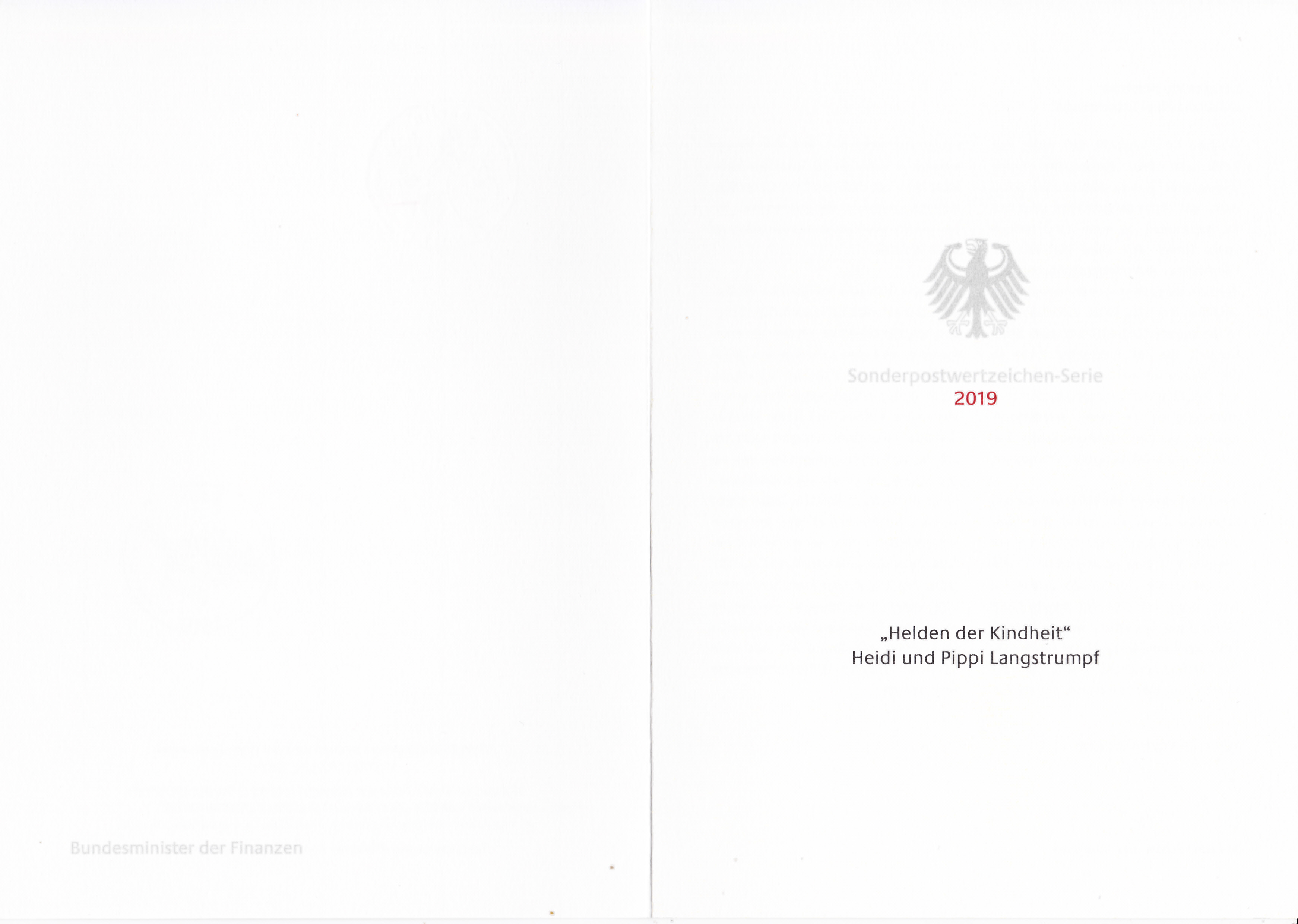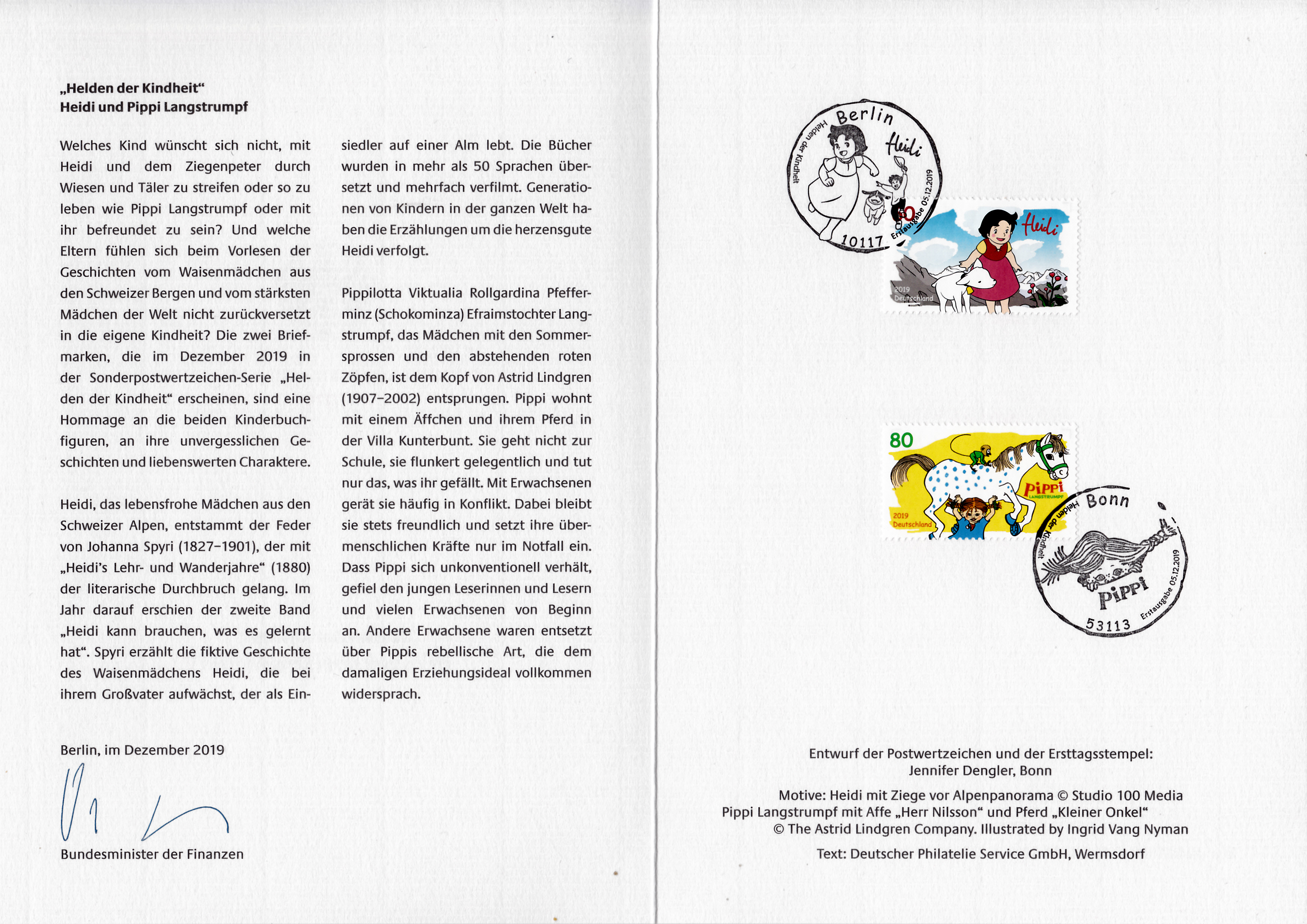 Ministerkarte des Finanzministers mit den zwei Marken aus der Serie "Helden der Kindheit" mit den Motiven "Heidi (MiNr 3506) und "Pippi Langstrumpf" (MiNr 3507) mit den beiden Ersttagsonderstempel Bonn und Berlin.