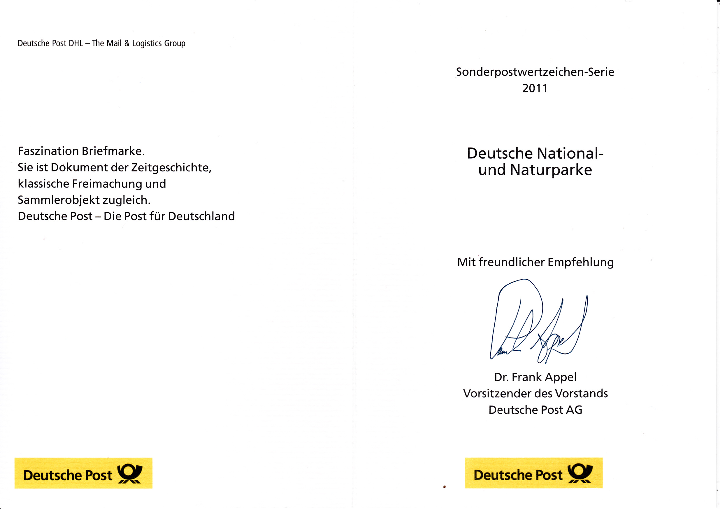 Klappkarte des Vorstandsvorsitzenden der Deutschen Post AG mit der einer Marke der Serie Deutsche National- und Naturparks mit dem Nationalpark Kellerwald-Edersee (MiNr 2841) und dem Ersttagsonderstempel Bonn.