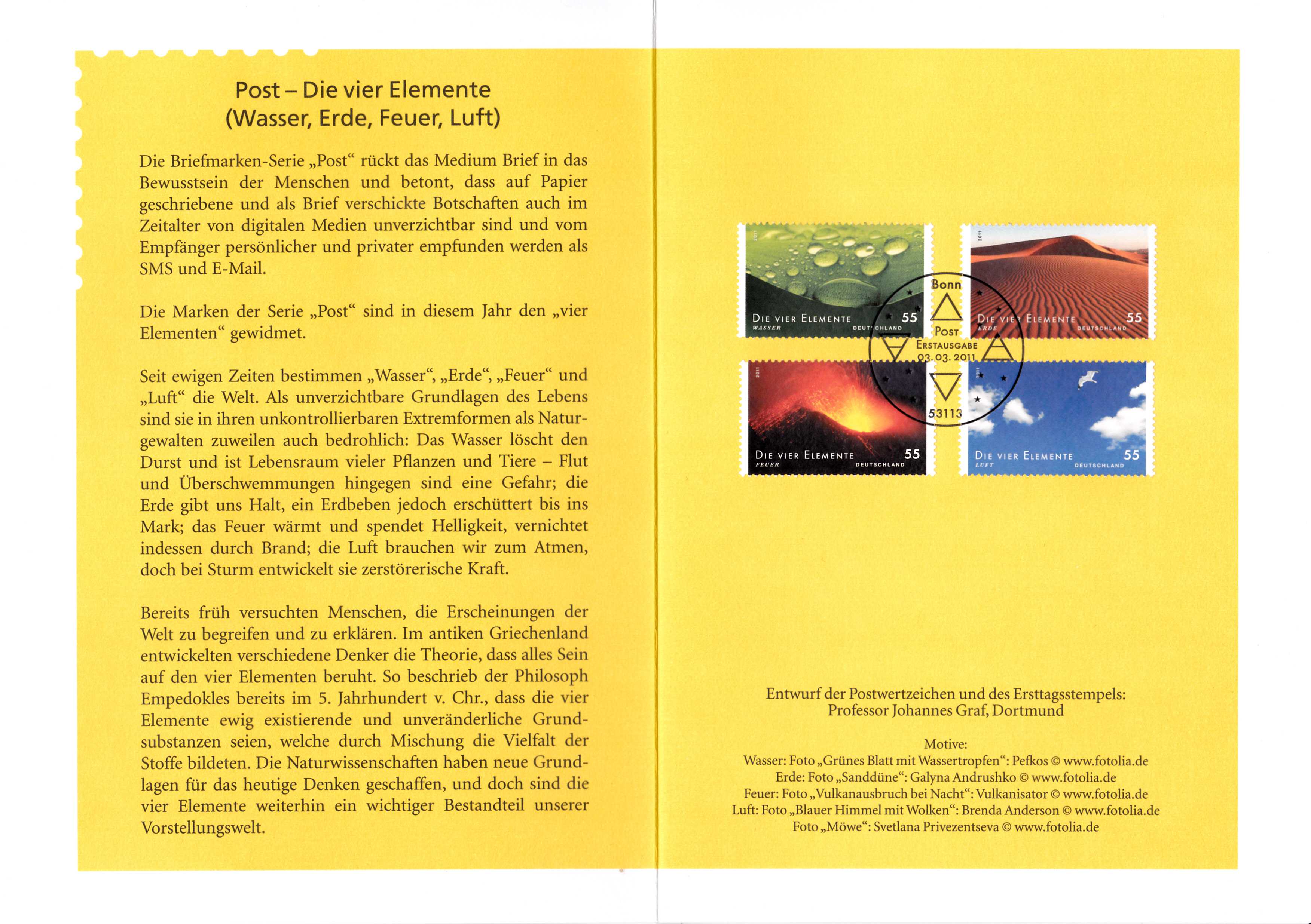 Klappkarte des Vorstandsvorsitzenden der Deutschen Post AG mit den vier Marken aus der Serie "Post": Die vier Elemente(MiNr 2852 bis 2855) und dem Ersttagsonderstempel Bonn.