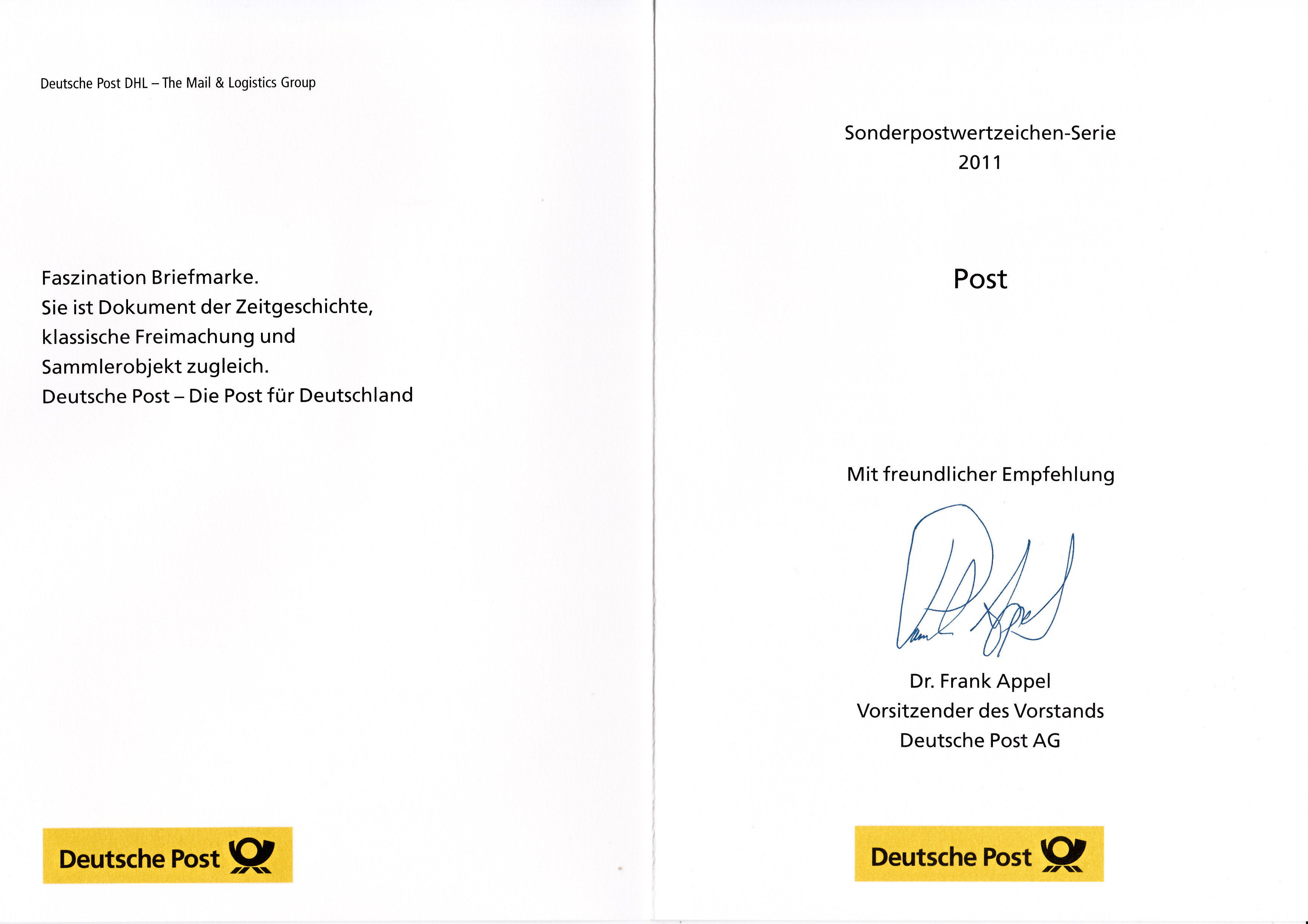 Klappkarte des Vorstandsvorsitzenden der Deutschen Post AG mit der Marke Zweiburgenblick im Werratal (MiNr 2847) und dem Ersttagsonderstempel Bonn.