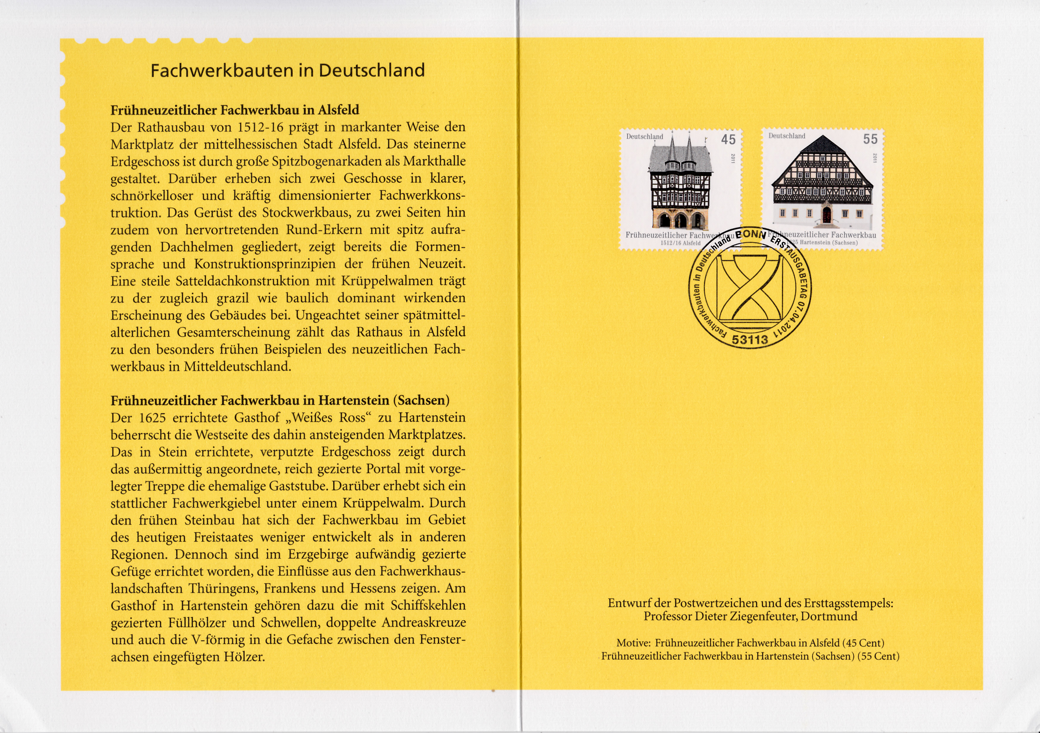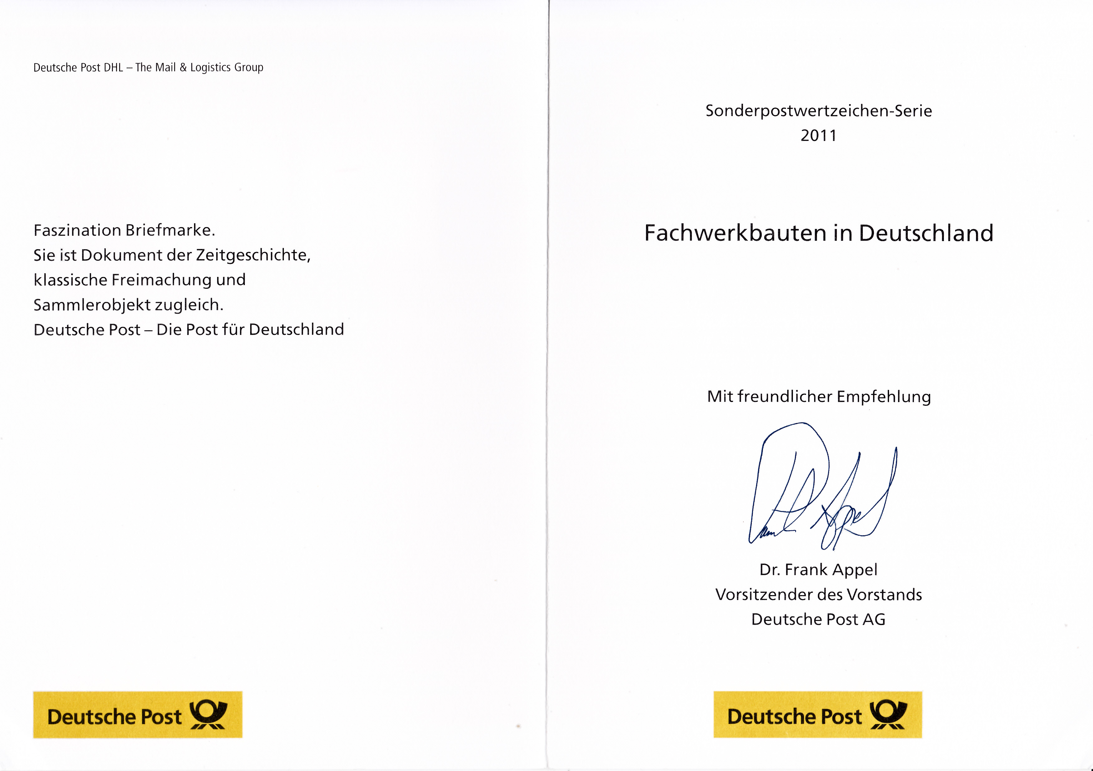 Klappkarte des Vorstandsvorsitzenden der Deutschen Post AG mit den beiden Marken aus der Serie "Fachwerkbauten in Deutschland" Alsfeld und Hartenstein (MiNr 2861 und 2862) und dem Ersttagsonderstempel Bonn.