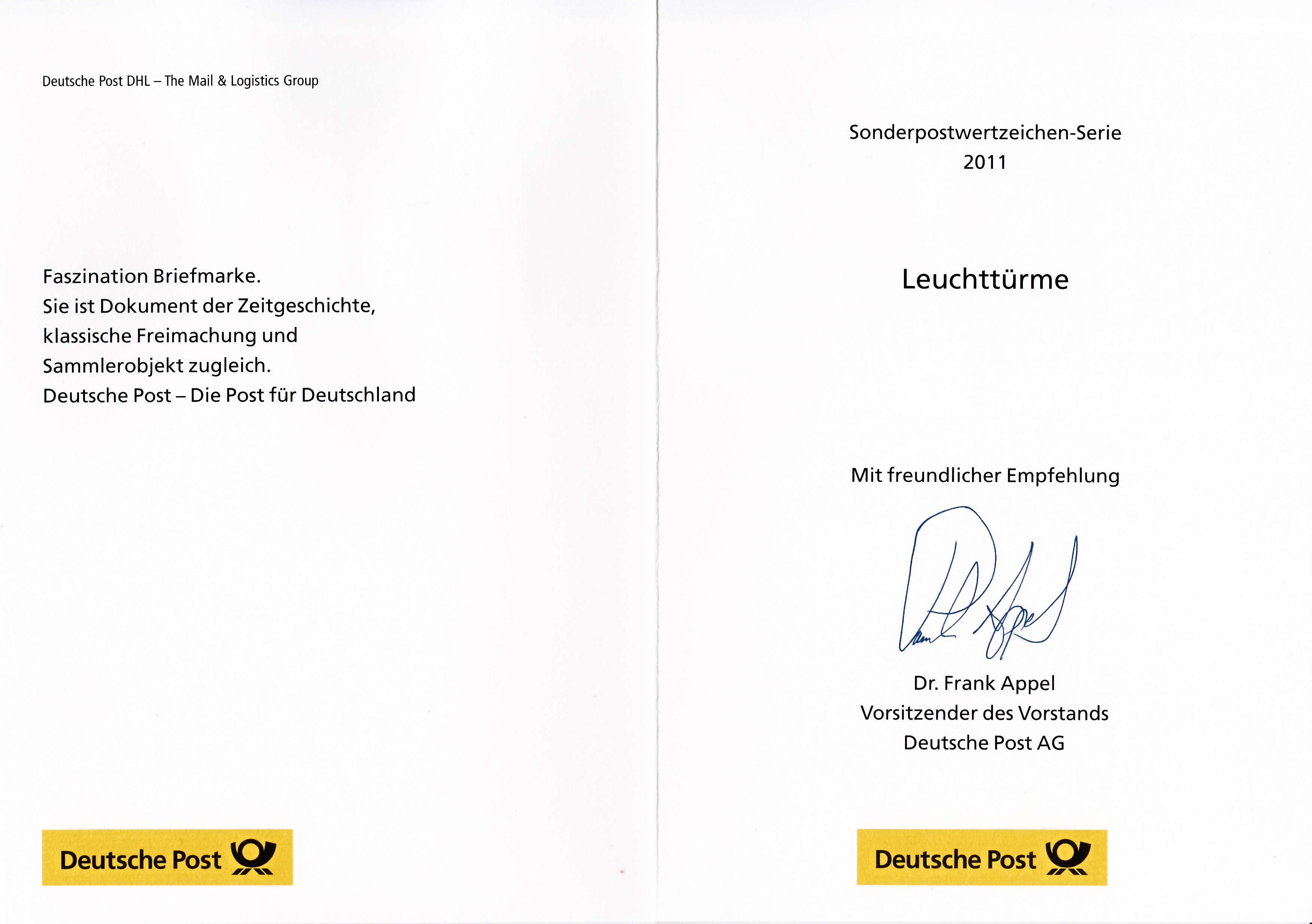 Klappkarte des Vorstandsvorsitzenden der Deutschen Post AG mit den beiden Marken aus der Serie "Leuchttürme" Arngast und Dahmeshöved (MiNr 2878 und 2879) und dem Ersttagsonderstempel Bonn.