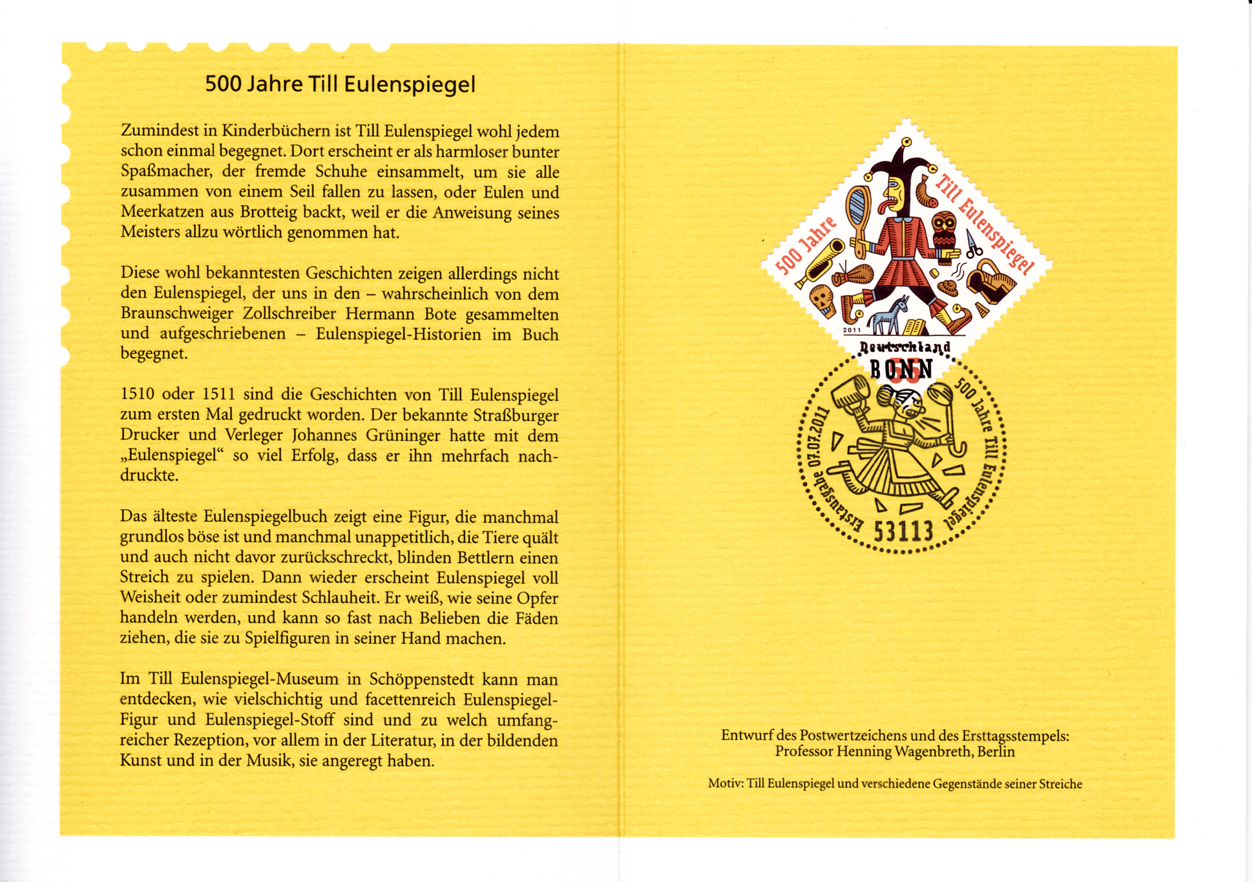 Klappkarte des Vorstandsvorsitzenden der Deutschen Post AG mit der Marke 500 Jahre Till Eulenspiegel (MiNr 2880) und dem Ersttagsonderstempel Bonn.