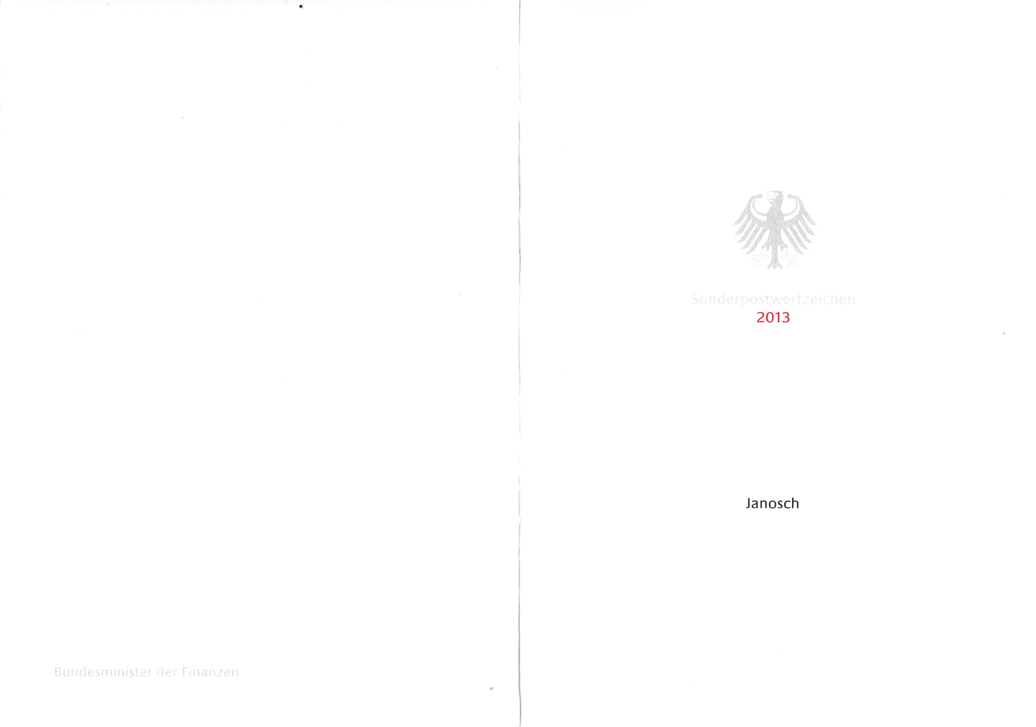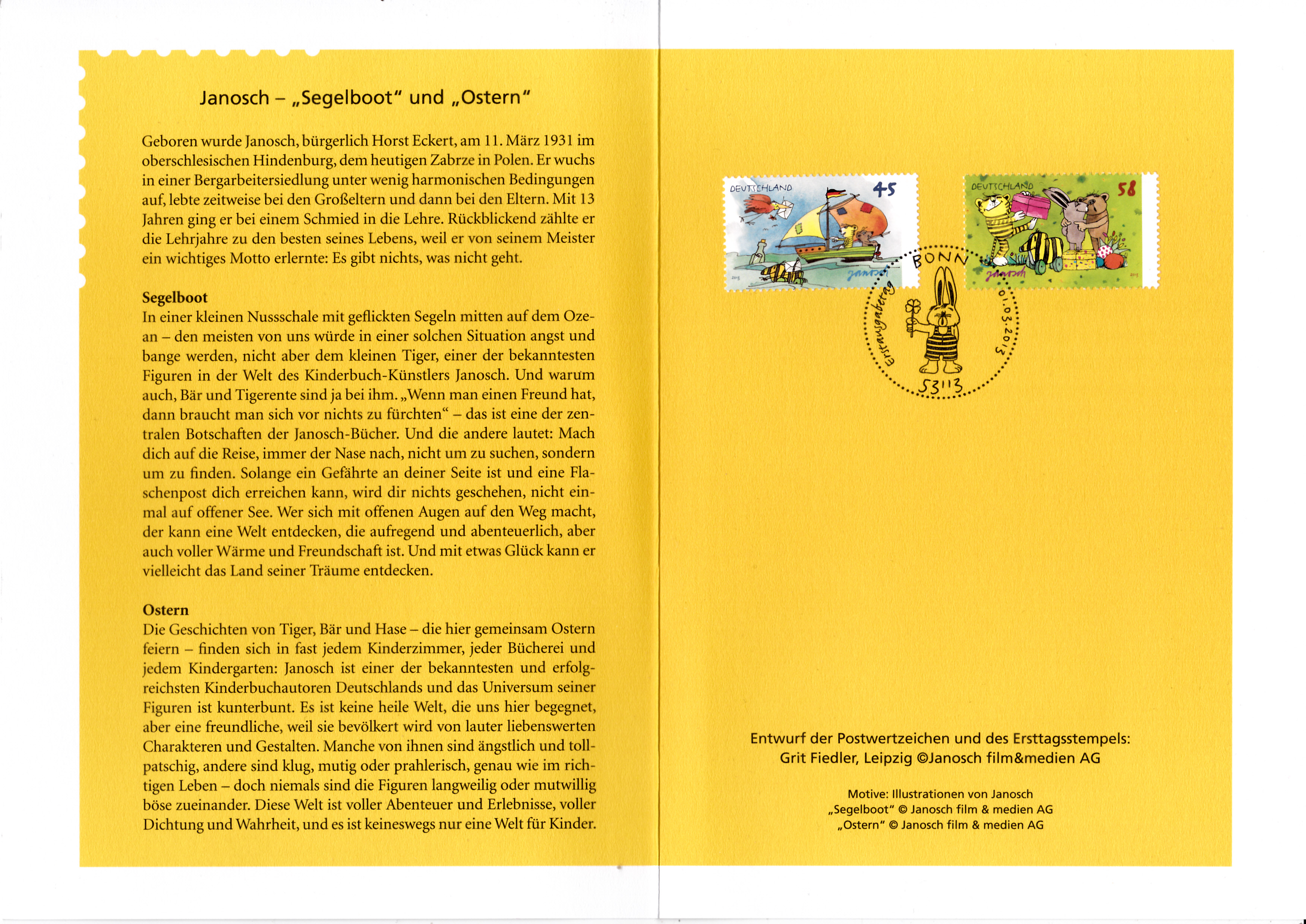 Klappkarte des Vorstandsvorsitzenden der Deutschen Post AG mit den beiden Marken mit den Janosch-Zeichnungen (MiNr 2992 und 2993) und dem Ersttagsonderstempel Bonn.