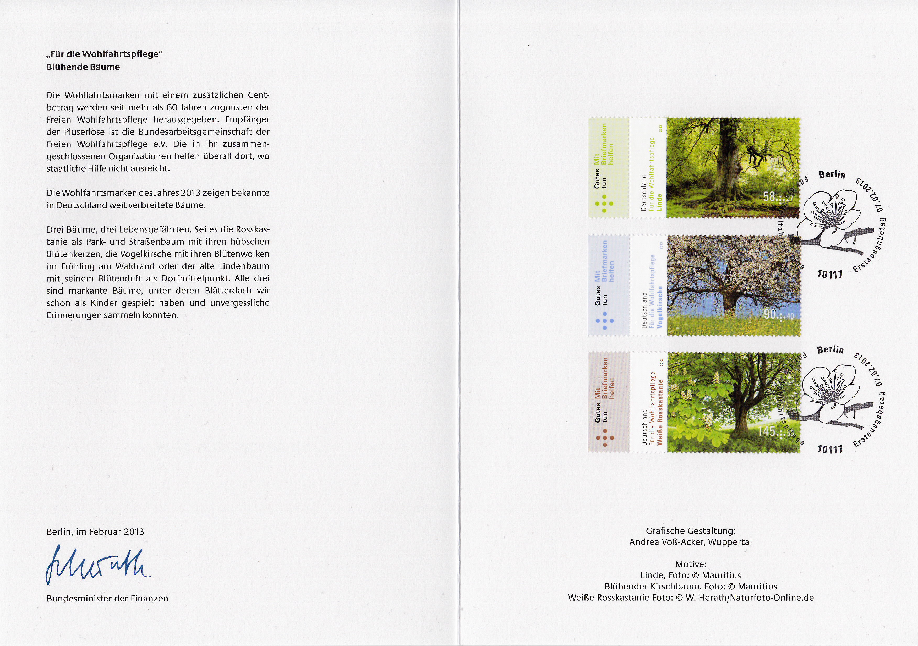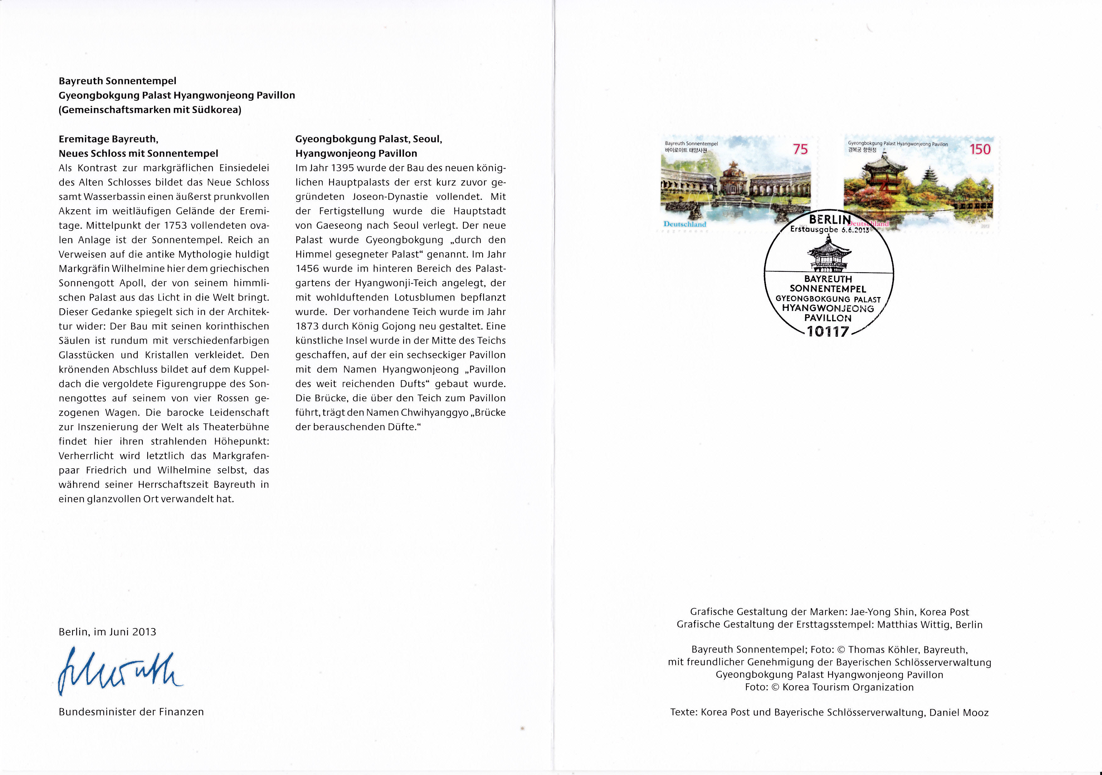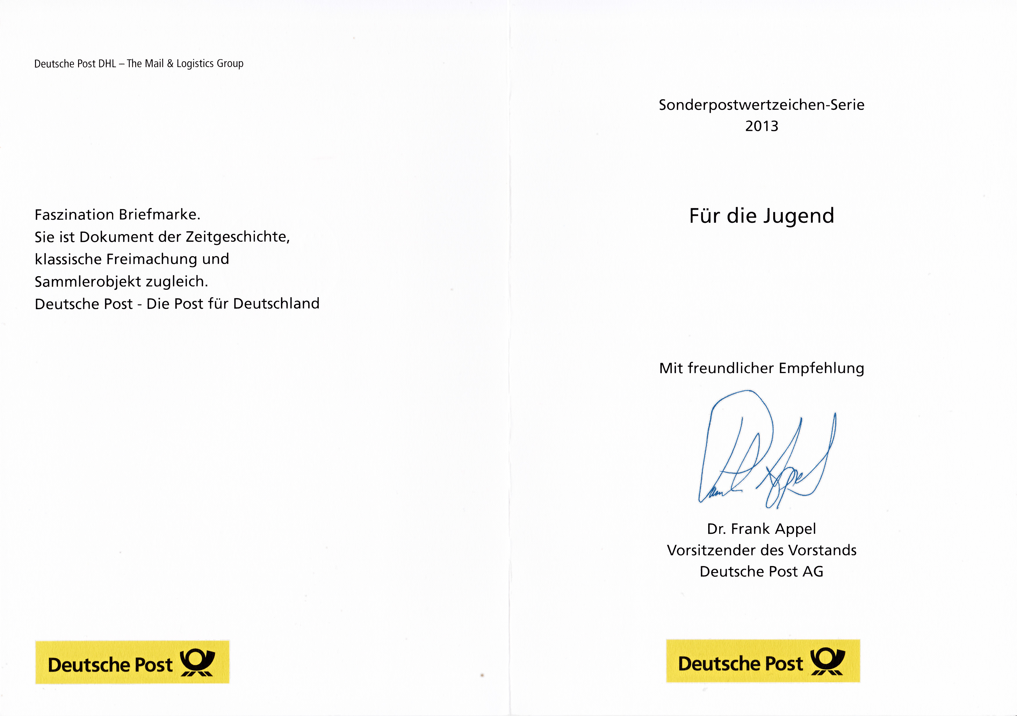 Die farbige Ministerkarte des Finanzministers mit den Marken "Für den Sport" 2007 enthält die vier Zuschlagsmarken des Jahres 2007. Eine kleine Besonderheit gibt es aber: Da die Marke zu 55+25 Cent zur Handball-Weltmeisterschaft bereits am 2.1.2007 erschienen ist, die drei weiteren Marken aber erst am 8.2.2007 tragen die zwei Ersttagstempel Berlin verschiedene Stempeldaten, die beiden Bonner Ersttagstempel haben das Datum 8.2.2007.