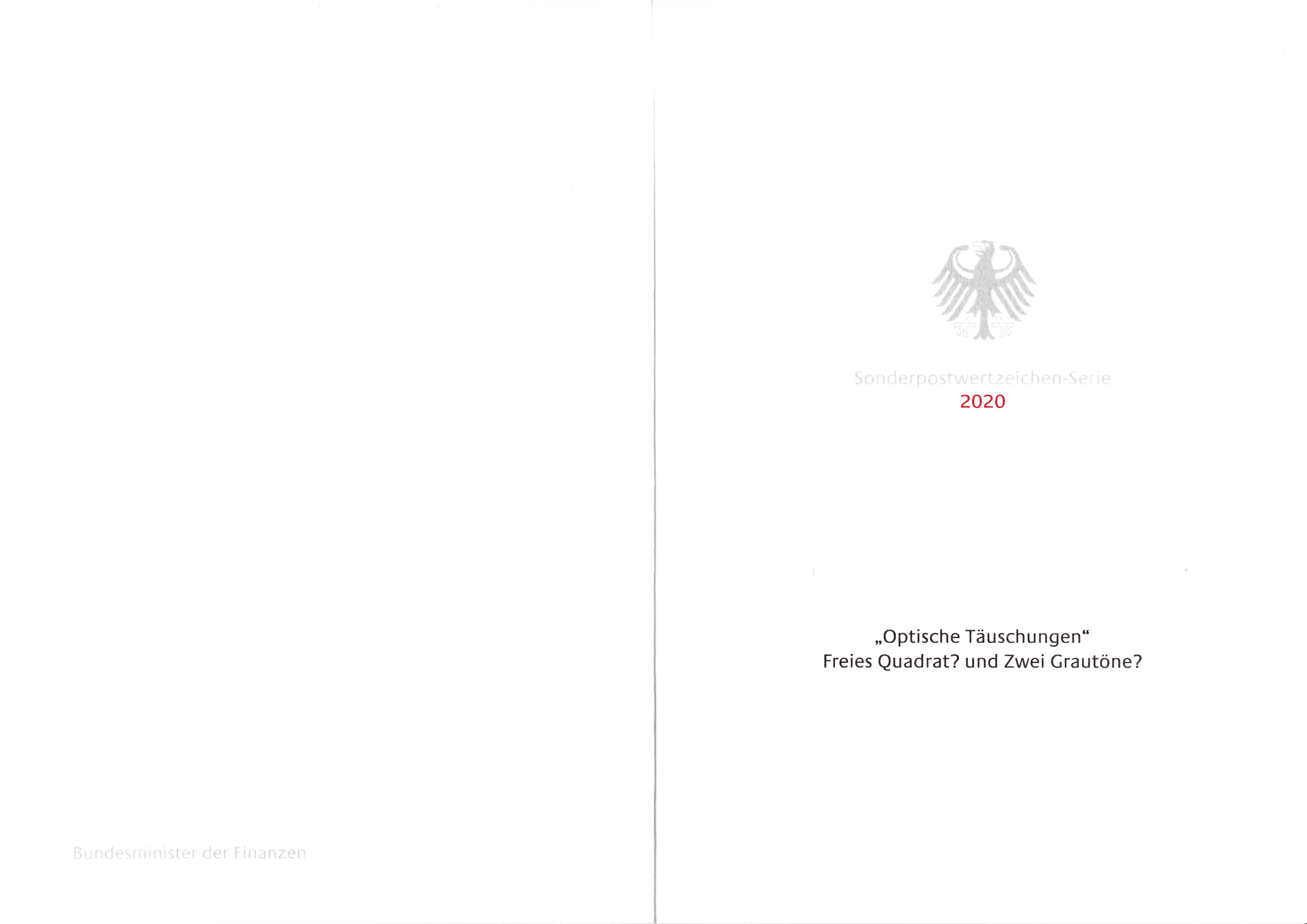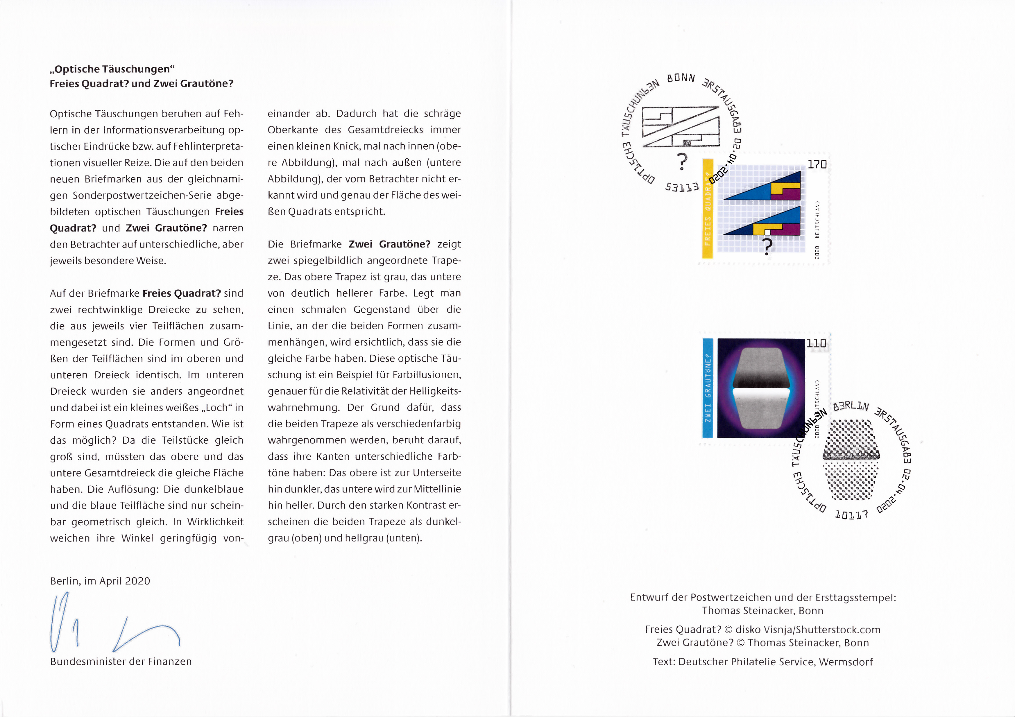 Ministerkarte des Finanzministers mit zwei Marken der Serie "Optische Täuschungen" mit den Motiven "Zwei Grautöne?" und "Freies Quadrat?" (MiNr 3536/37) und den beiden Ersttagsonderstempel Bonn und Berlin.