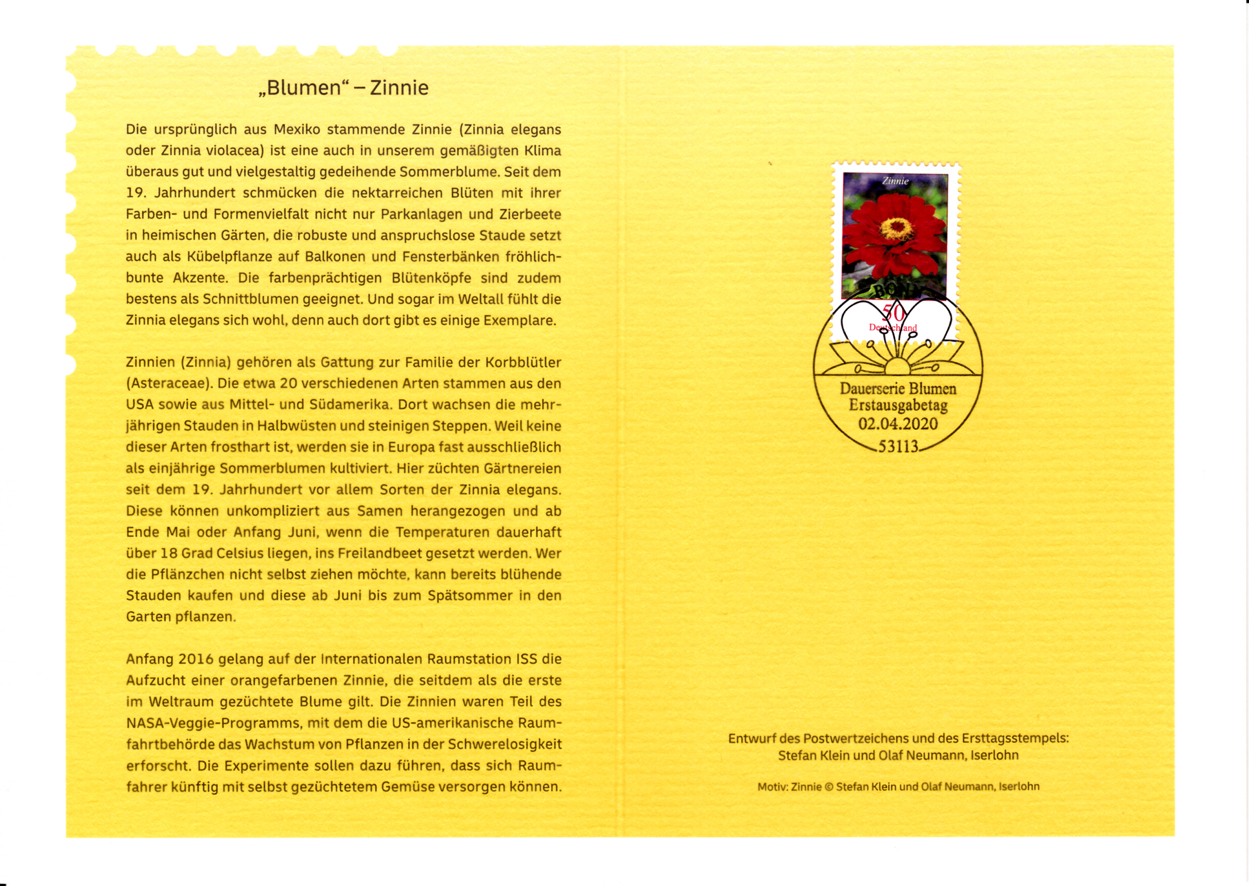 Jetzt kommen die Ministerkarten aus dem April 2020. Ministerkarte des Finanzministers mit zwei Marken der Dauerserie "Blumen" zu 50 Cent mit dem Motiv "Zinnie (Zinnia elegans)" (MiNr 3535) und den beiden Ersttagsonderstempel Bonn und Berlin.