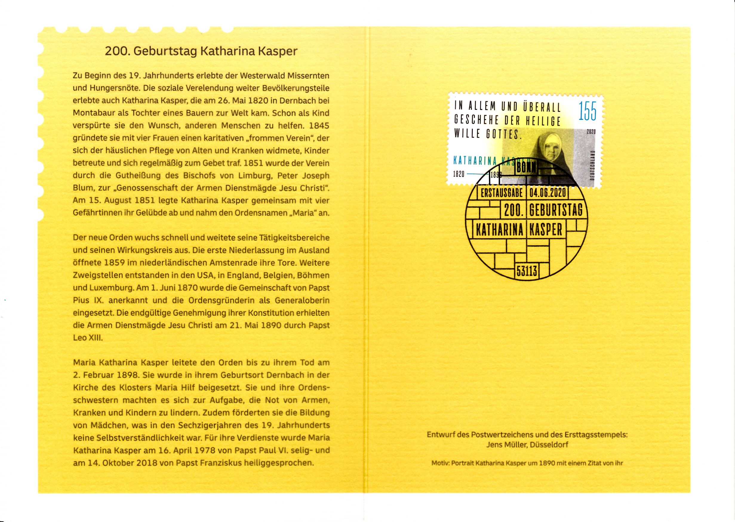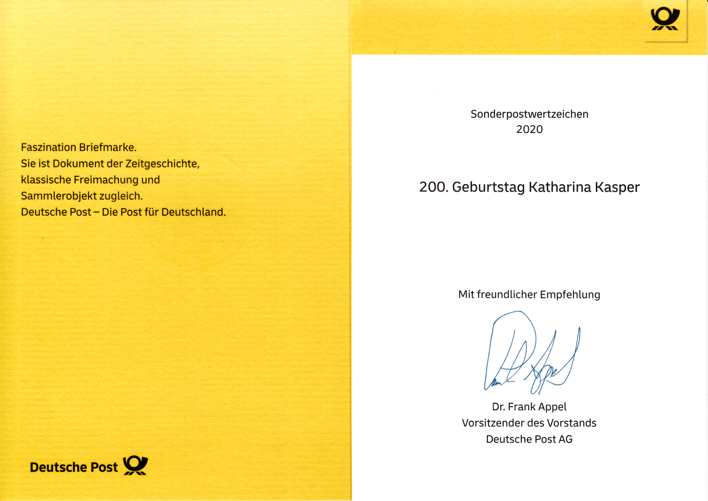 Klappkarte des Vorstandsvorsitzenden der Deutschen Post AG mit einer Marke zum 200. Geburtstag von Katharina Kasper (MiNr 3548) und dem Ersttagsonderstempel Bonn.