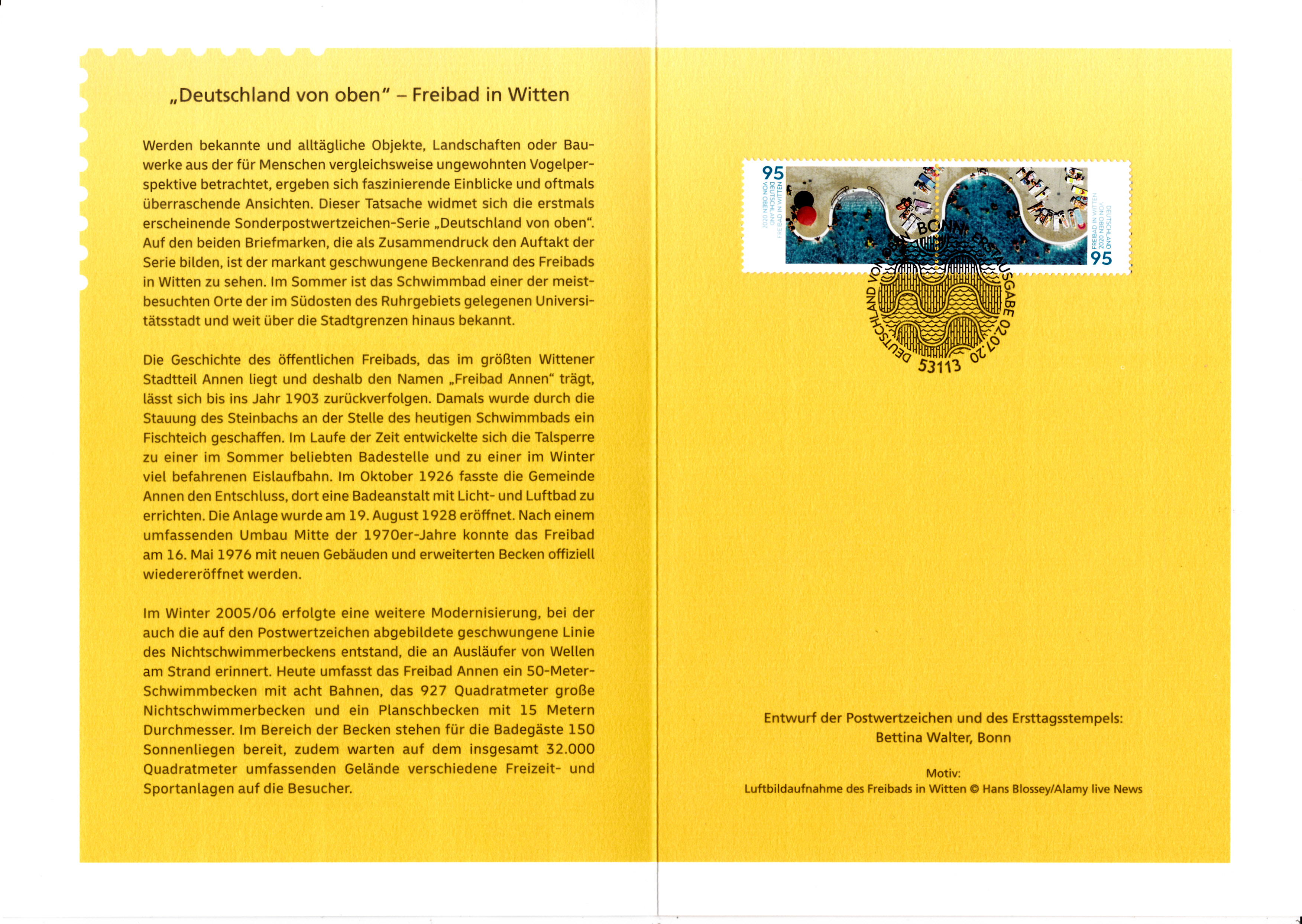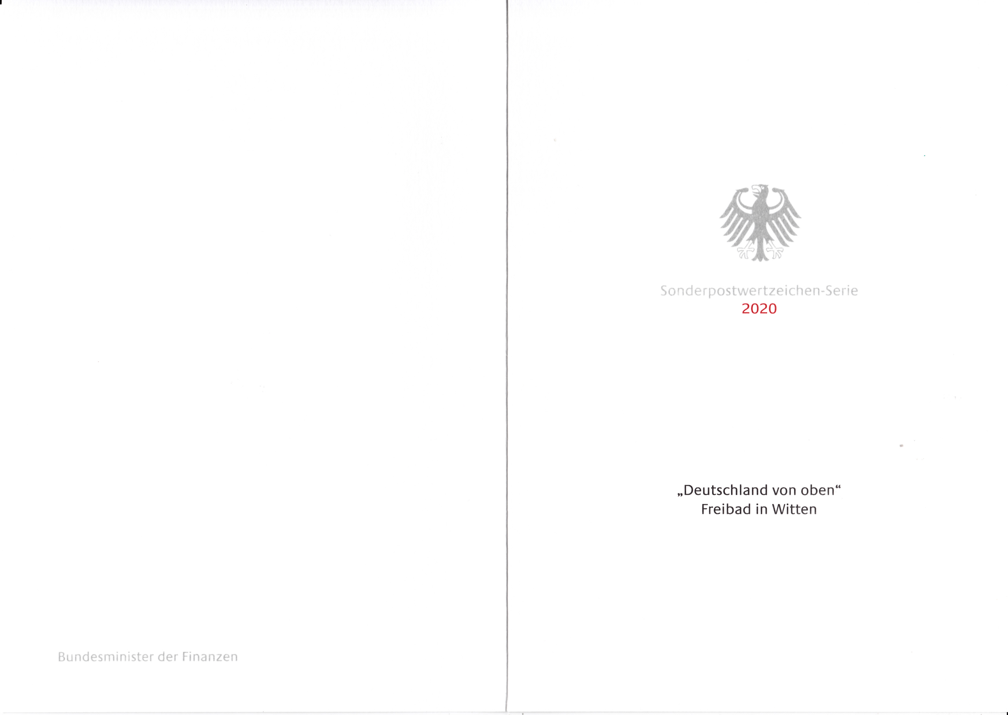 Im Juli 2020 gab es folgende Ministerkarten: Ministerkarte des Finanzministers mit zwei Zusammendrucke aus der Serie "Deutschland von oben" mit dem Motiv "Freibad in Witten" (MiNr 3550/51) und den beiden Ersttagsonderstempel Bonn und Berlin.