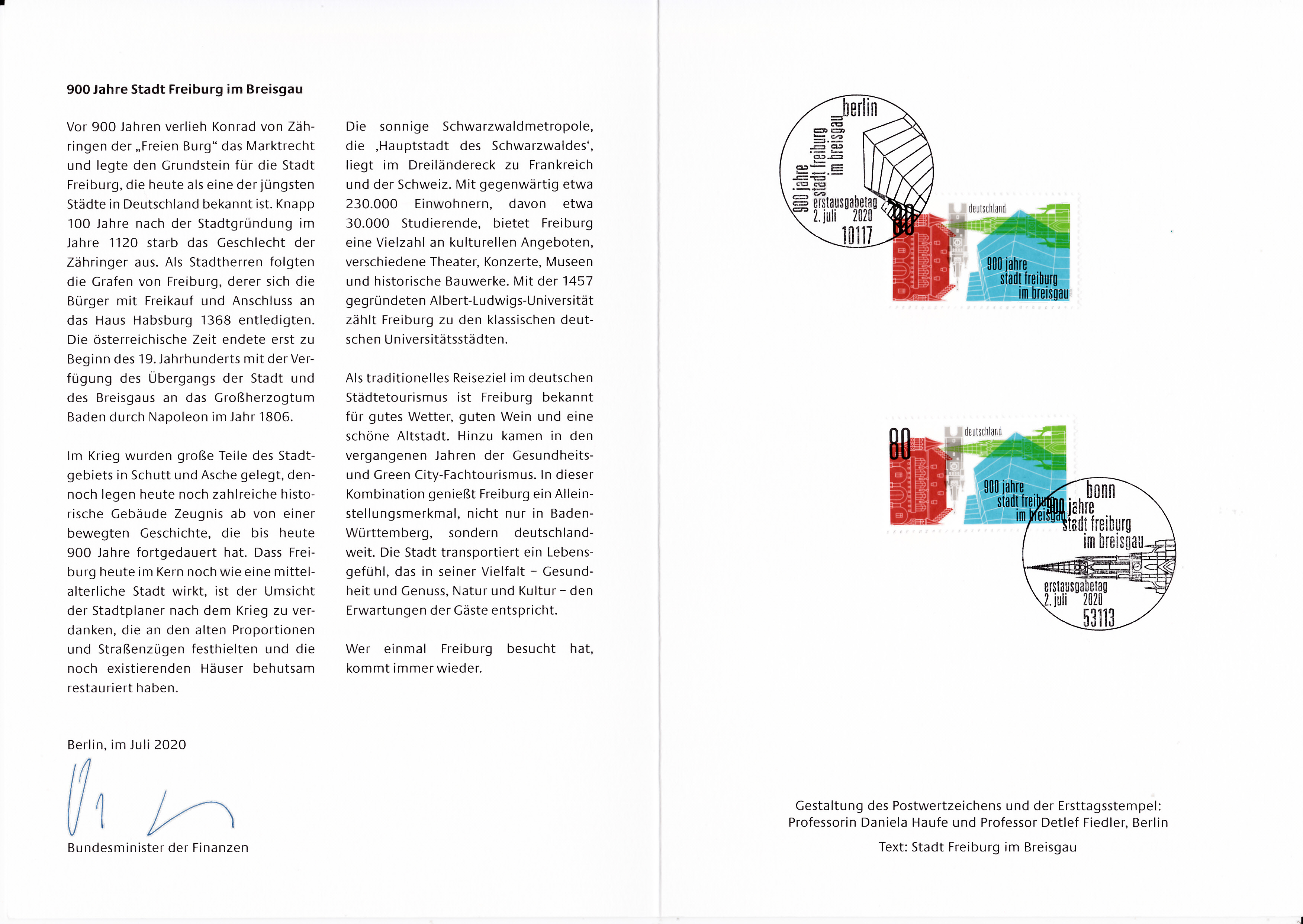 Ministerkarte des Finanzministers mit zwei Marken "900 Jahre Stadt Freiburg im Breisgau" (MiNr 3553) und den beiden Ersttagsonderstempel Bonn und Berlin.