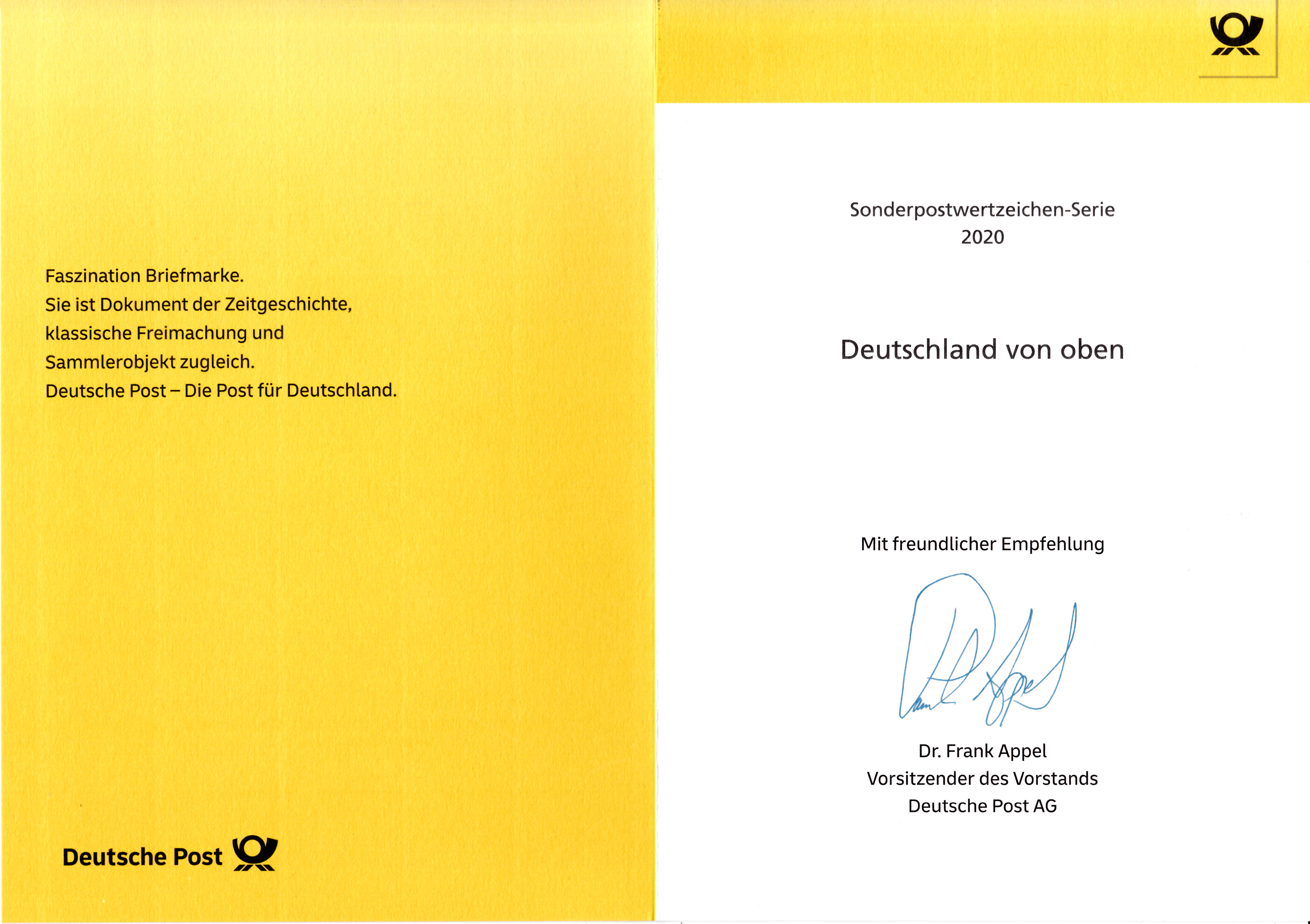 Klappkarte des Vorstandsvorsitzenden der Deutschen Post AG mit einem Zusammendrucke aus der Serie "Deutschland von oben" mit dem Motiv "Freibad in Witten" (MiNr 3550/51) und dem Ersttagsonderstempel Bonn.