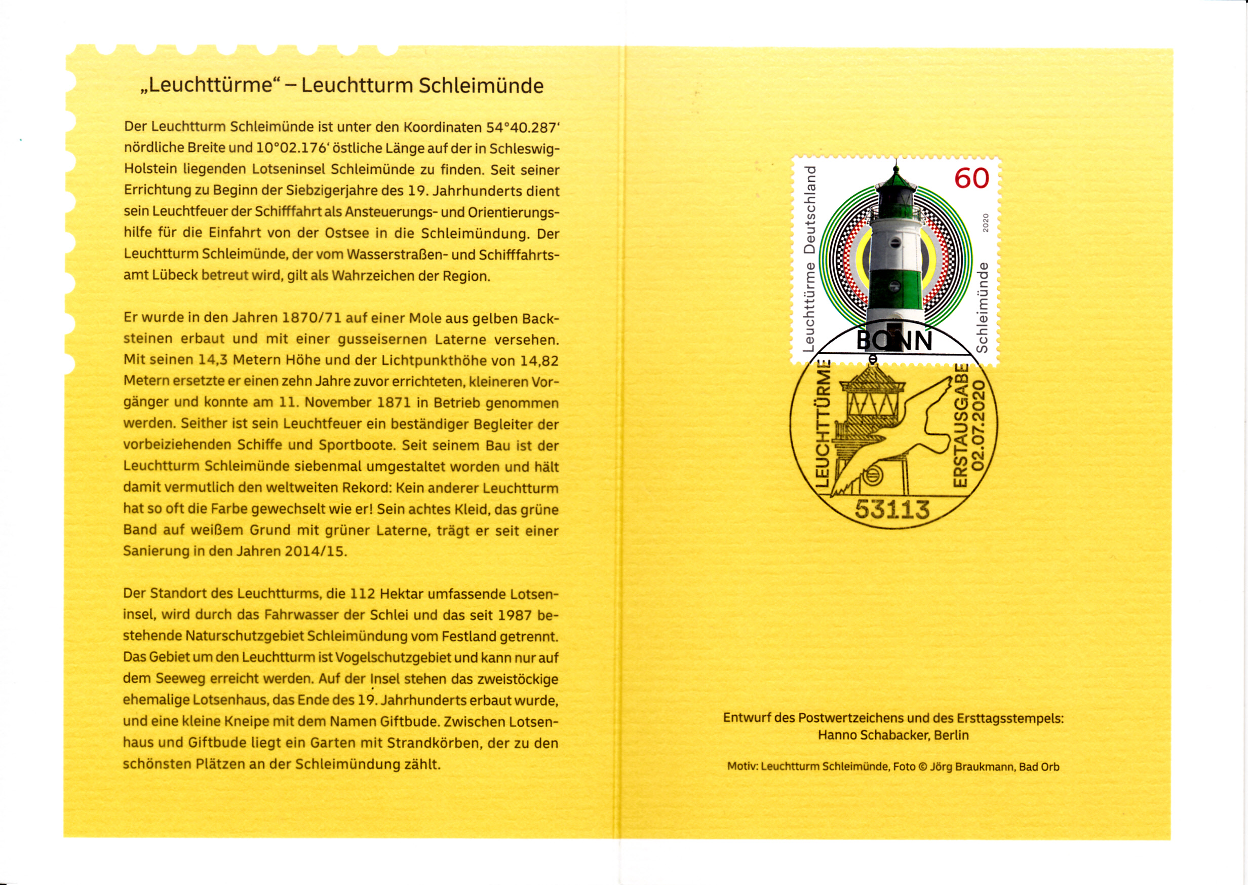Klappkarte des Vorstandsvorsitzenden der Deutschen Post AG mit einer Marke aus der Serie "Leuchttürme" mit dem Motiv "Leuchtturm Schleimünde" (MiNr 3552) und dem Ersttagsonderstempel Bonn.