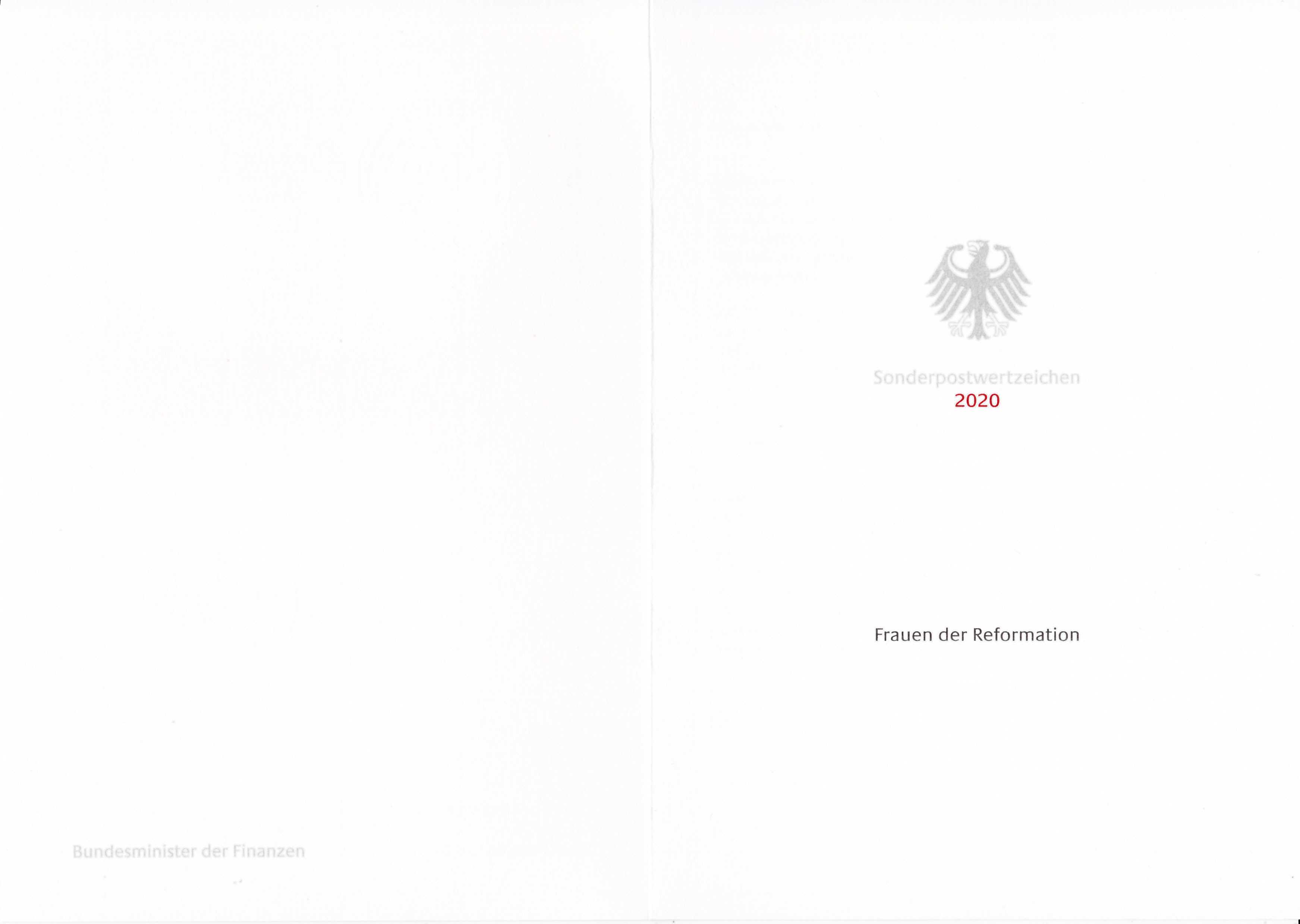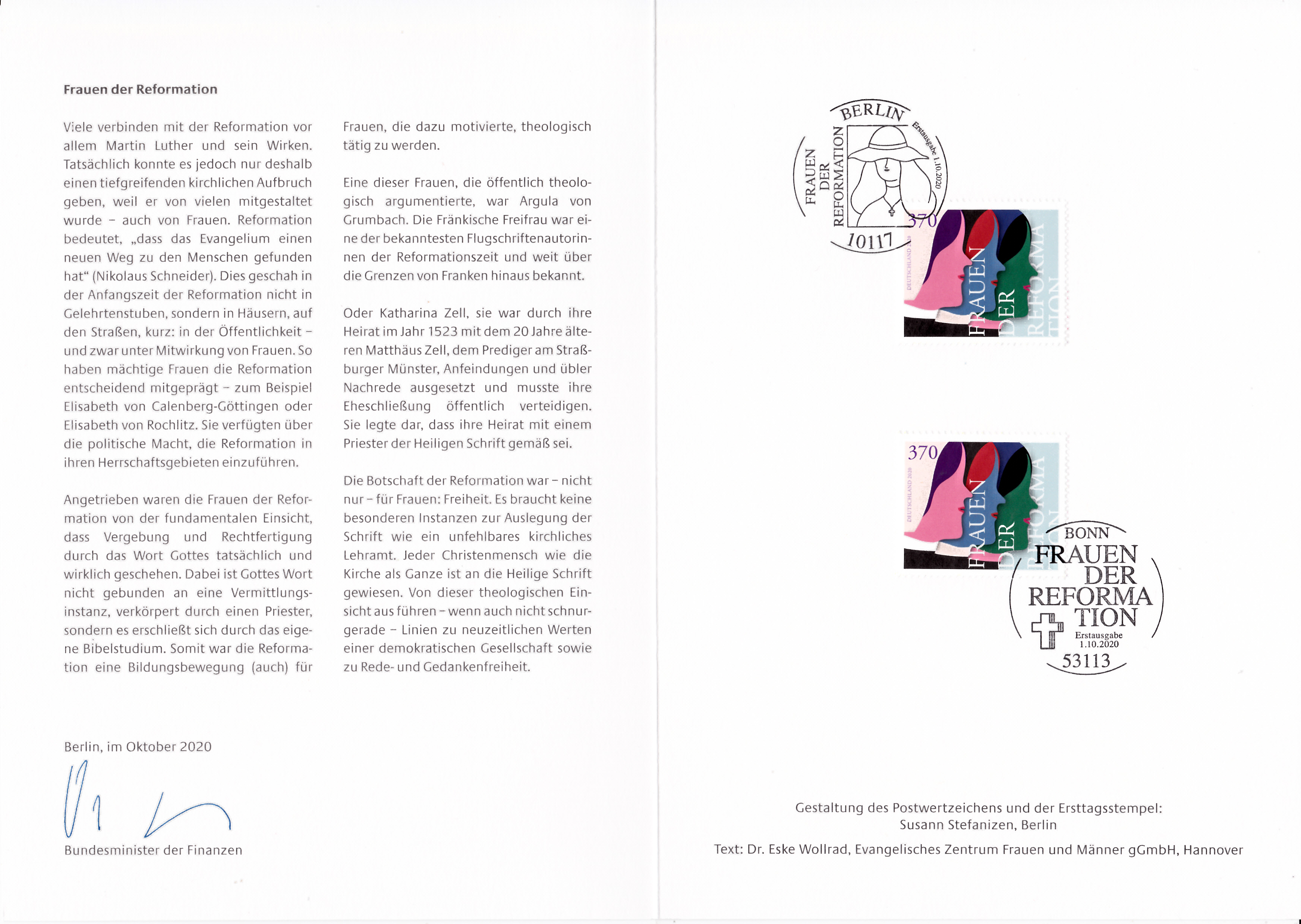 Ministerkarte des Finanzministers mit zwei Marken "Frauen der Reformation" (MiNr 3569) und den Ersttagsonderstempel Berlin und Bonn gestempelt.