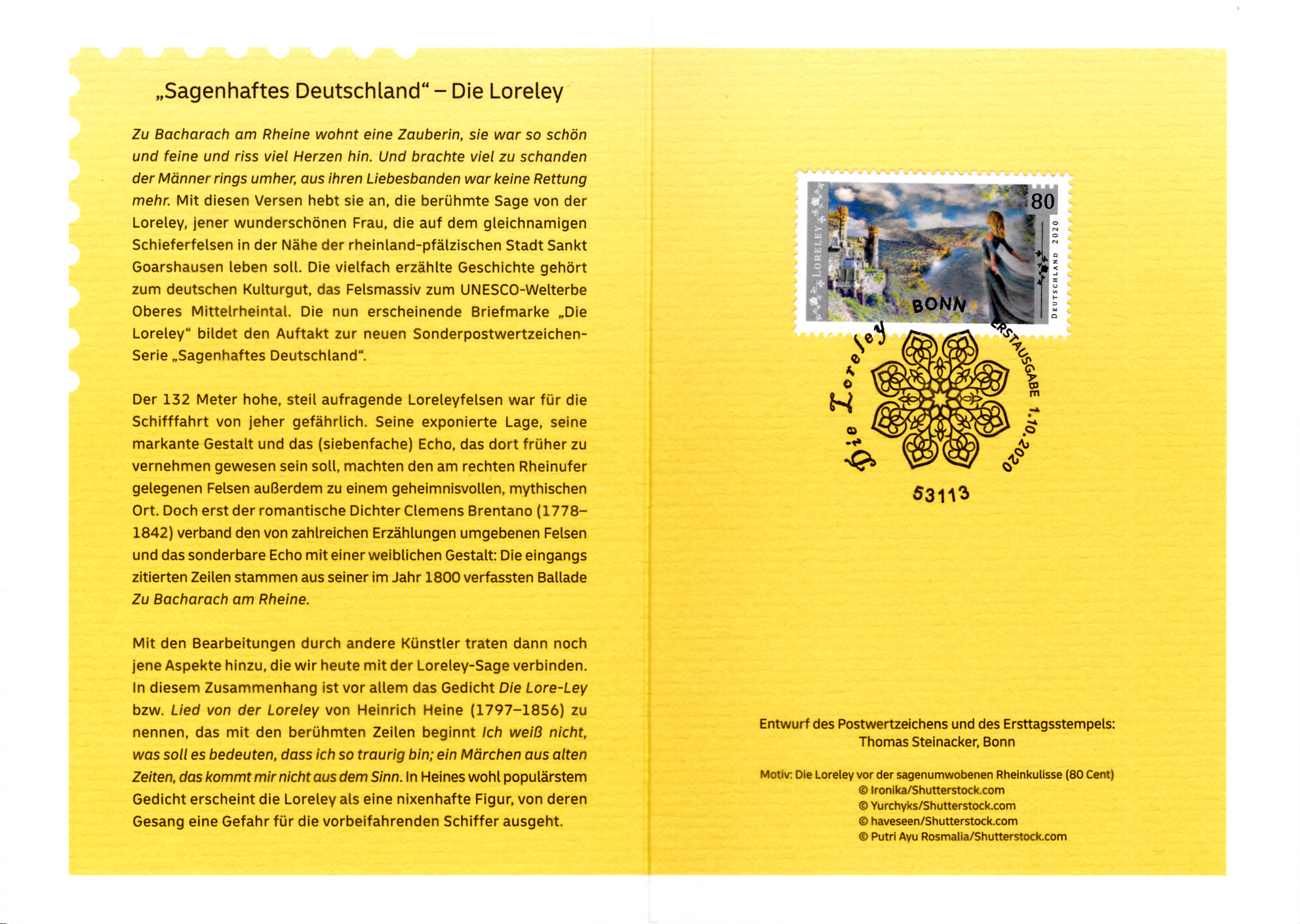 Klappkarte des Vorstandsvorsitzenden der Deutschen Post AG mit einer Marke aus der Serie "Sagenhaftes Deutschland" (MiNr 3567) mit dem Motive "Loreley, auf Burg Rheinstein in das Flusstal blickend" und mit den Ersttagsonderstempel Bonn.