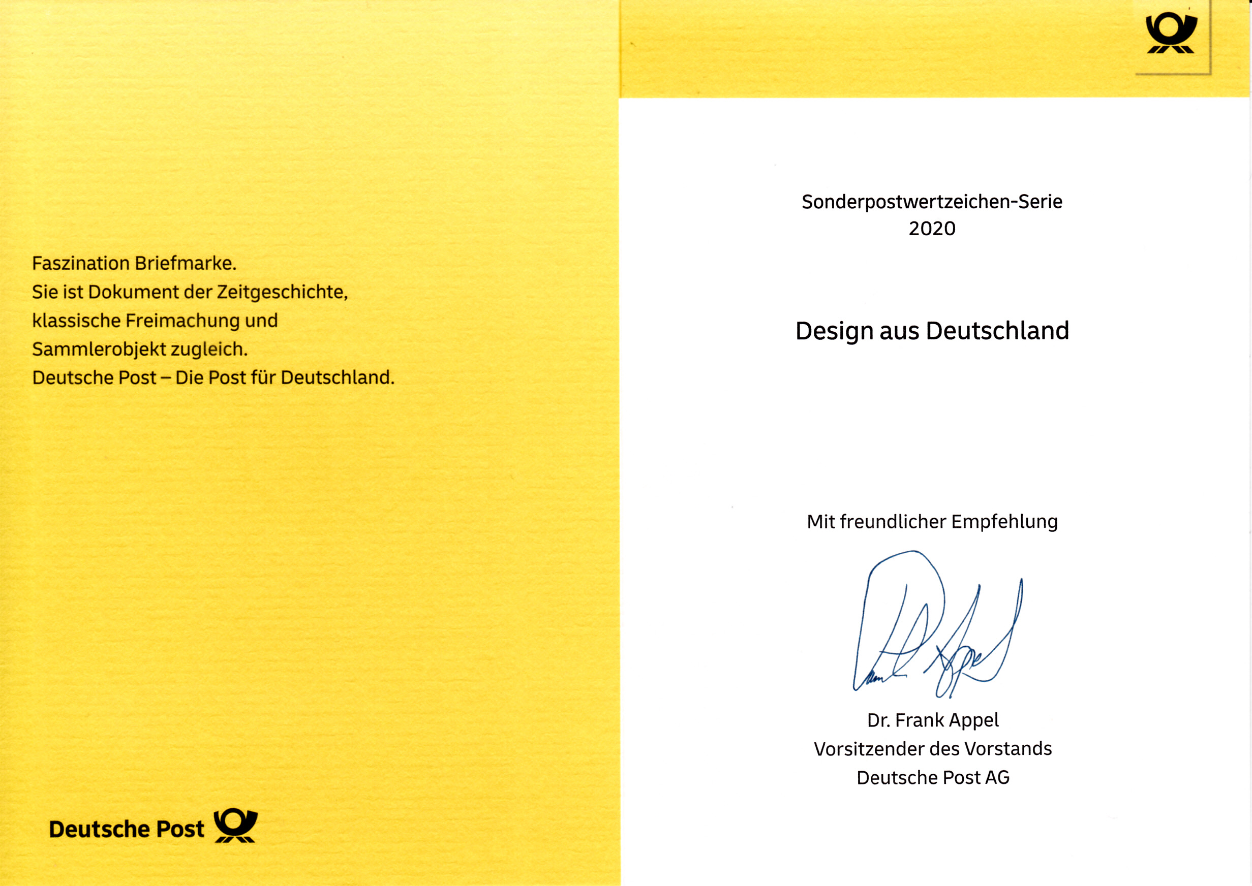 Klappkarte des Vorstandsvorsitzenden der Deutschen Post AG mit einer Marke aus der Serie "Design aus Deutschland" (MiNr 3566) mit dem Motive "Kaffeeservice von Karl Dittert" und mit den Ersttagsonderstempel Bonn.