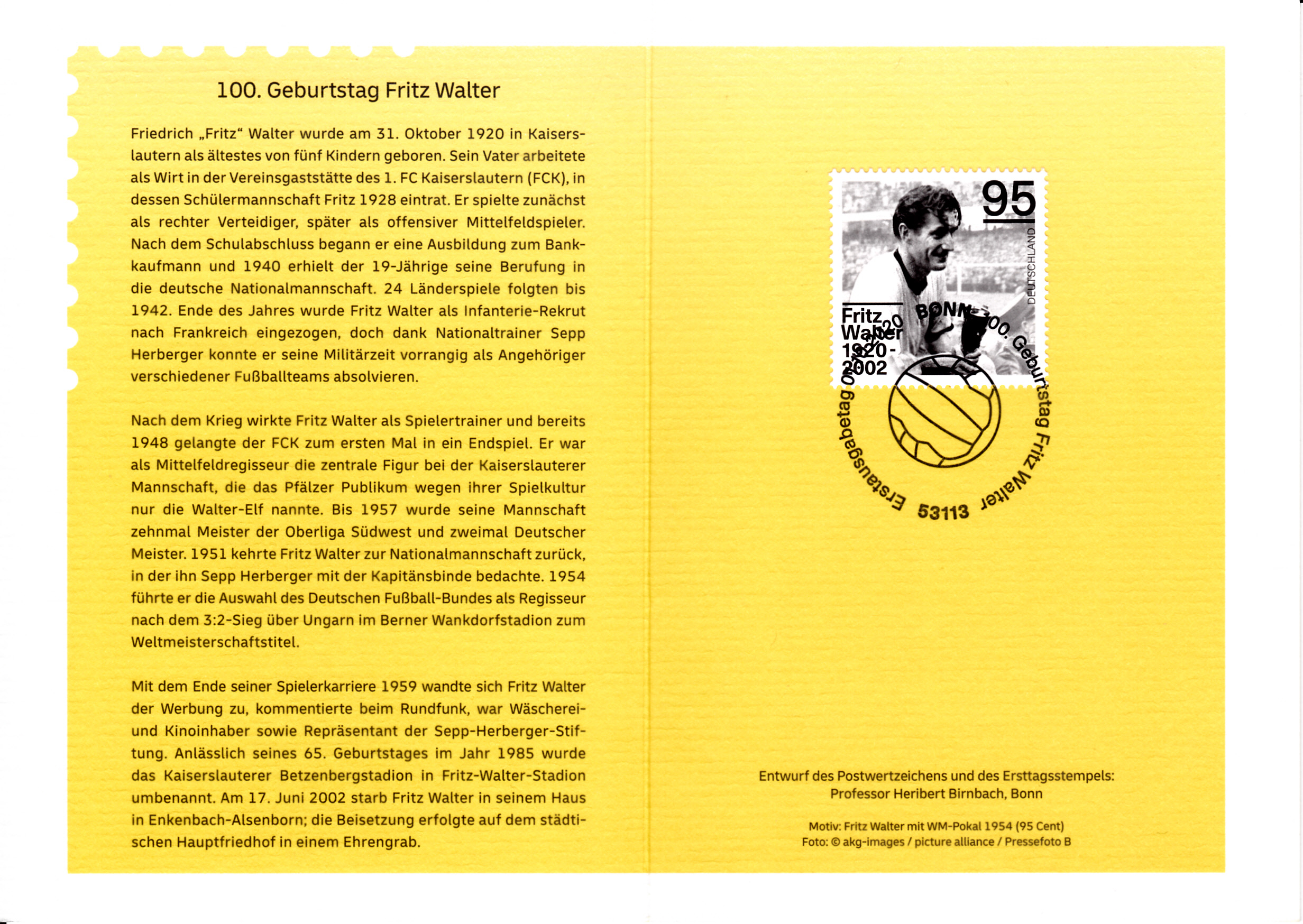 Klappkarte des Vorstandsvorsitzenden der Deutschen Post AG mit einer Marke zum 100. Geburtstag von Fritz Walter (MiNr 3568) und mit den Ersttagsonderstempel Bonn.
