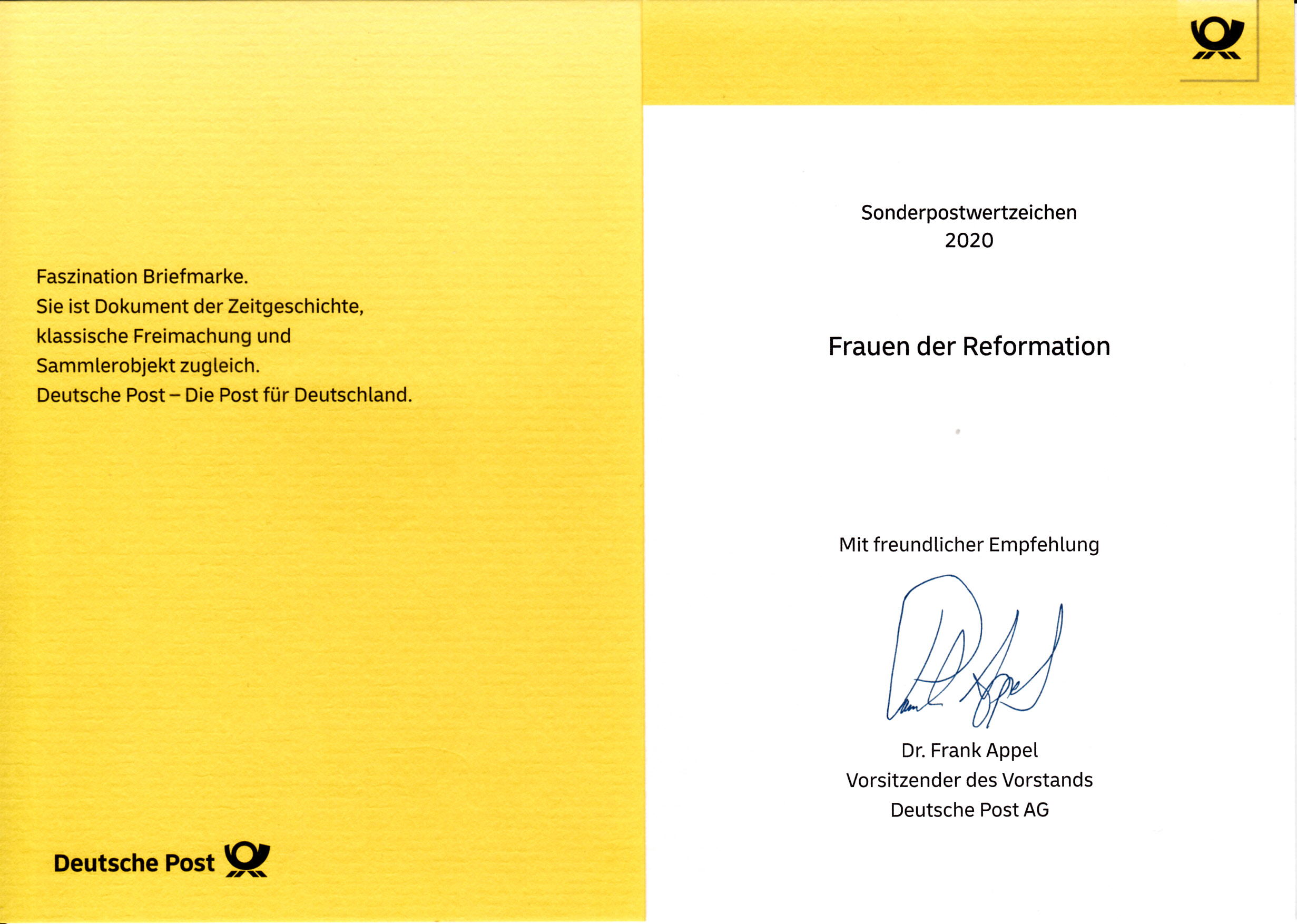 Klappkarte des Vorstandsvorsitzenden der Deutschen Post AG mit einer Marke "Frauen der Reformation" (MiNr 3569) und mit den Ersttagsonderstempel Bonn.